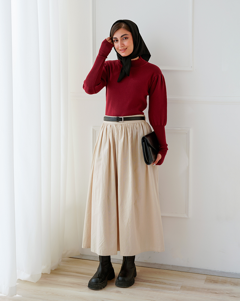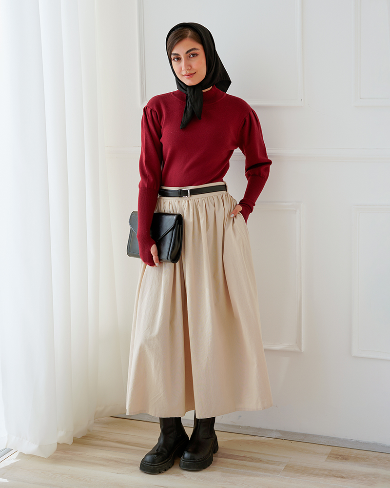 - توضیحات محصول: جنس بلوز، بافت لطیف می باشد. بلوز بقه ایستاده و آستین بلند است. این محصول کشسانی بالایی دارد.