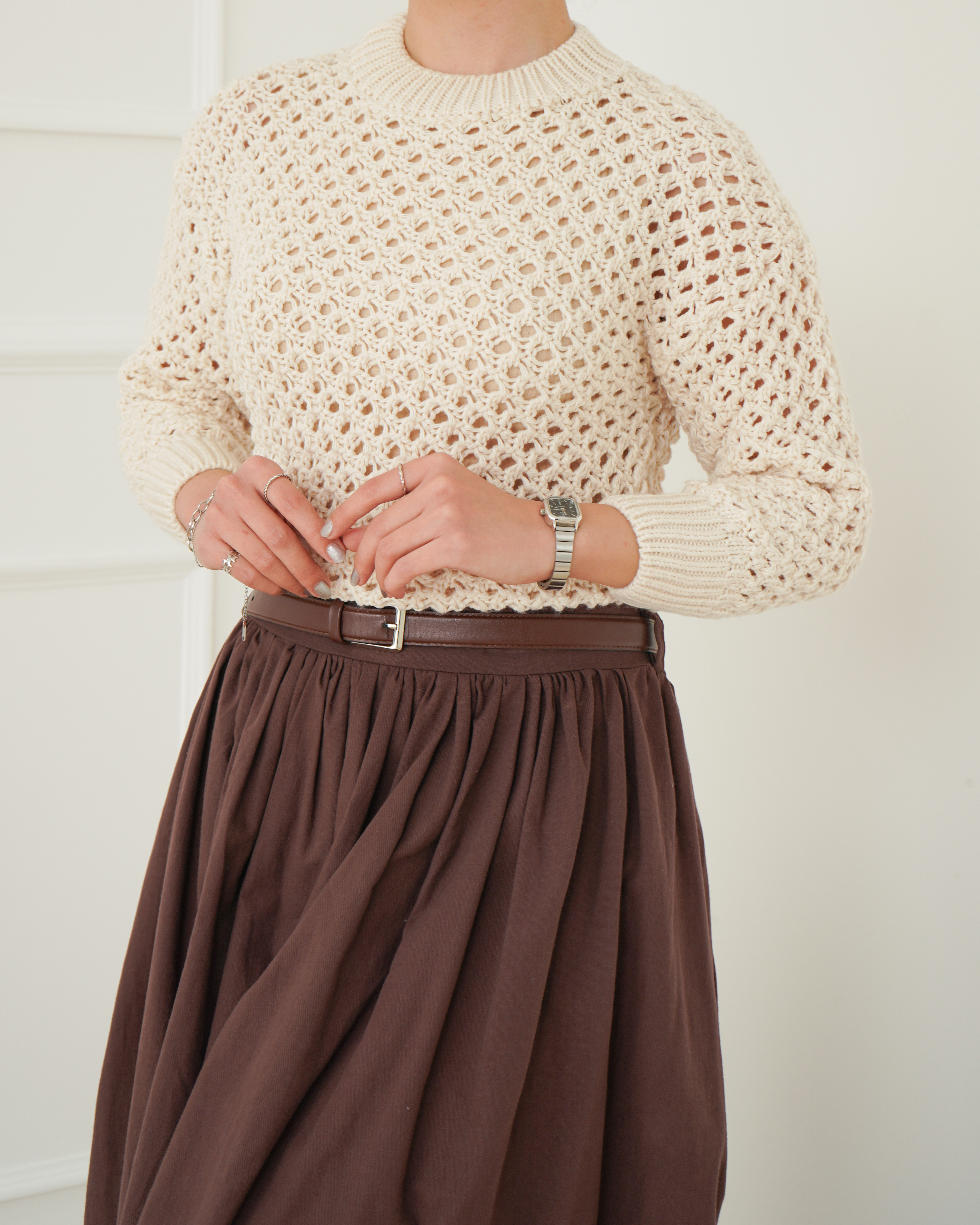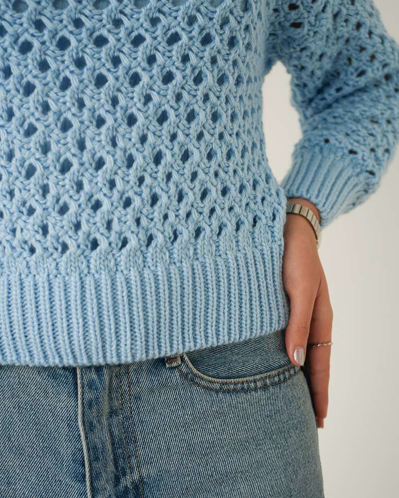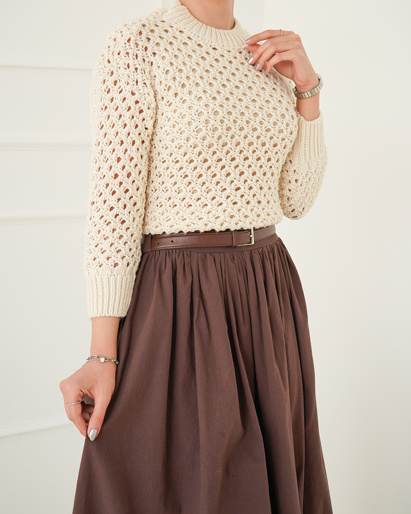 - توضیحات محصول: جنس بلوز بافت قلاب بافی شده می باشد. بلوز کراپ یقه گرد و استین بلند است. این محصول بسیار نرم و لطیف همراه با کشسانی بالا می باشد. بلوز بدن نما است.