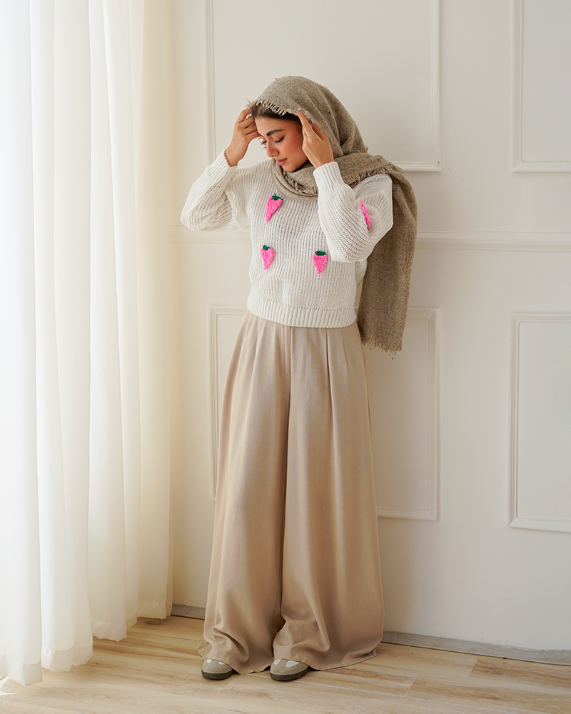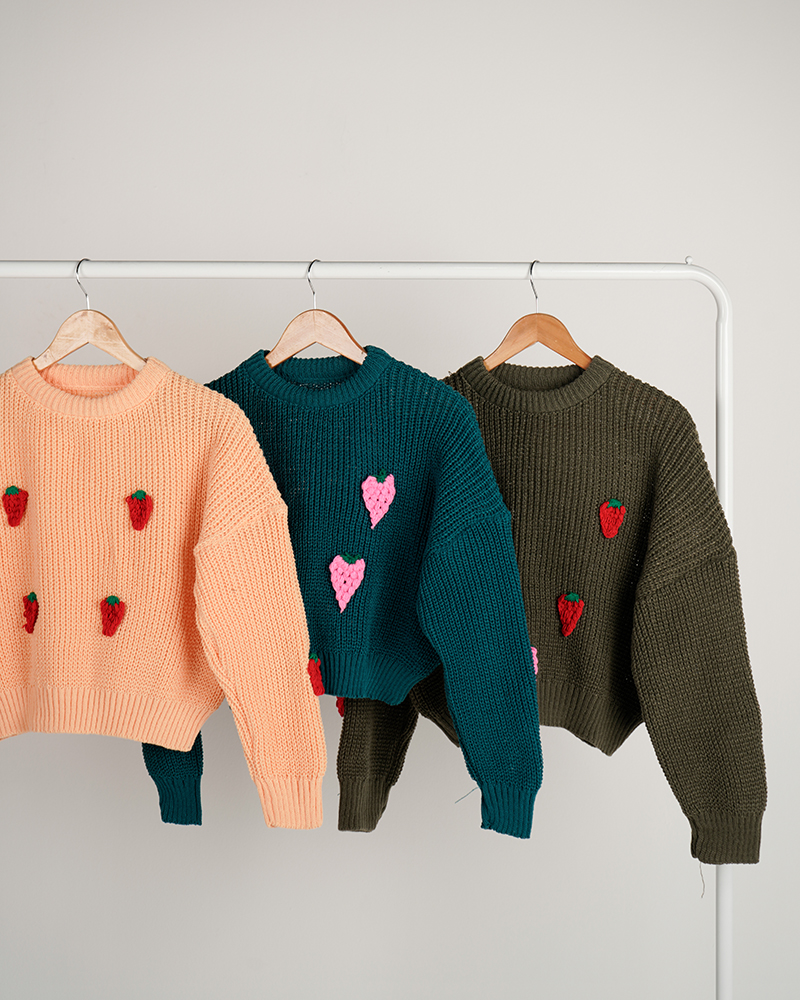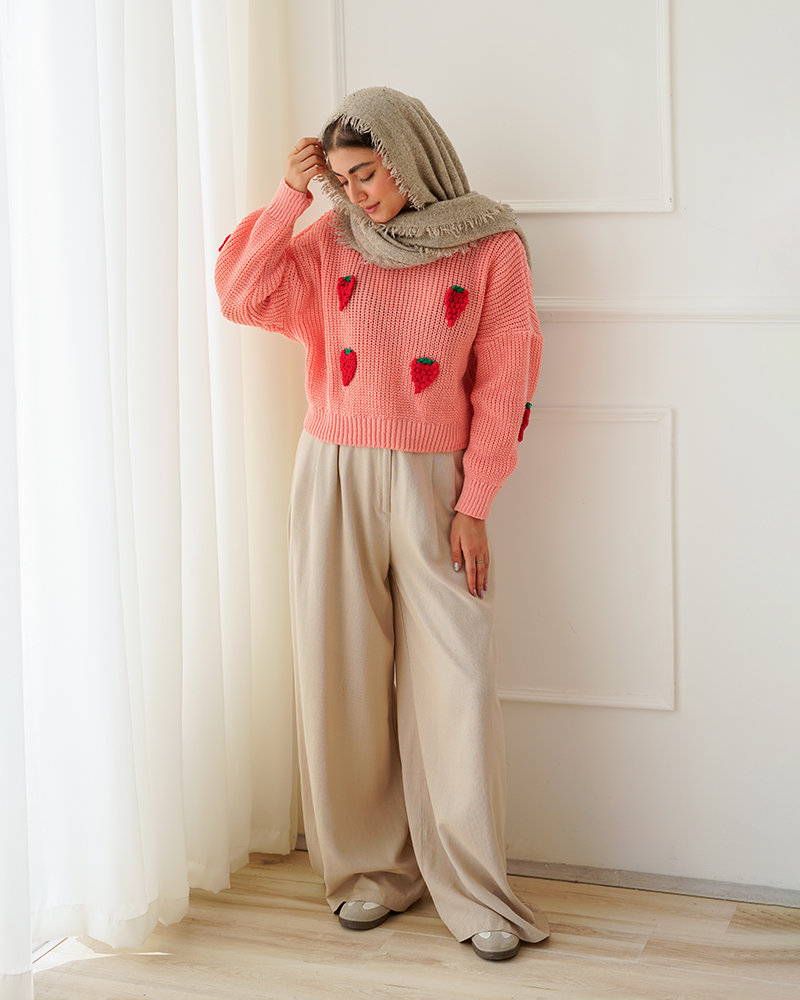 - توضیحات محصول: جنس بلوز بافت می باشد. بلوز یقه گرد و آستین بلند است. توت فرنگی های روی لباس برجسته می باشد.