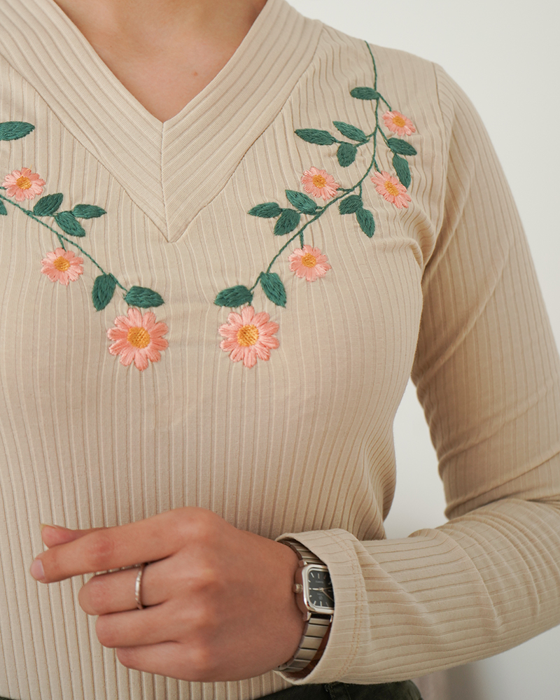 - توضیحات محصول: جنس بلوز، نخ پنبه کبریتی است. بلوز، یقه هفت و آستین بلند می باشد. طرح های روی لباس، گلدوزی است. این محصول کشسانی بالایی دارد.