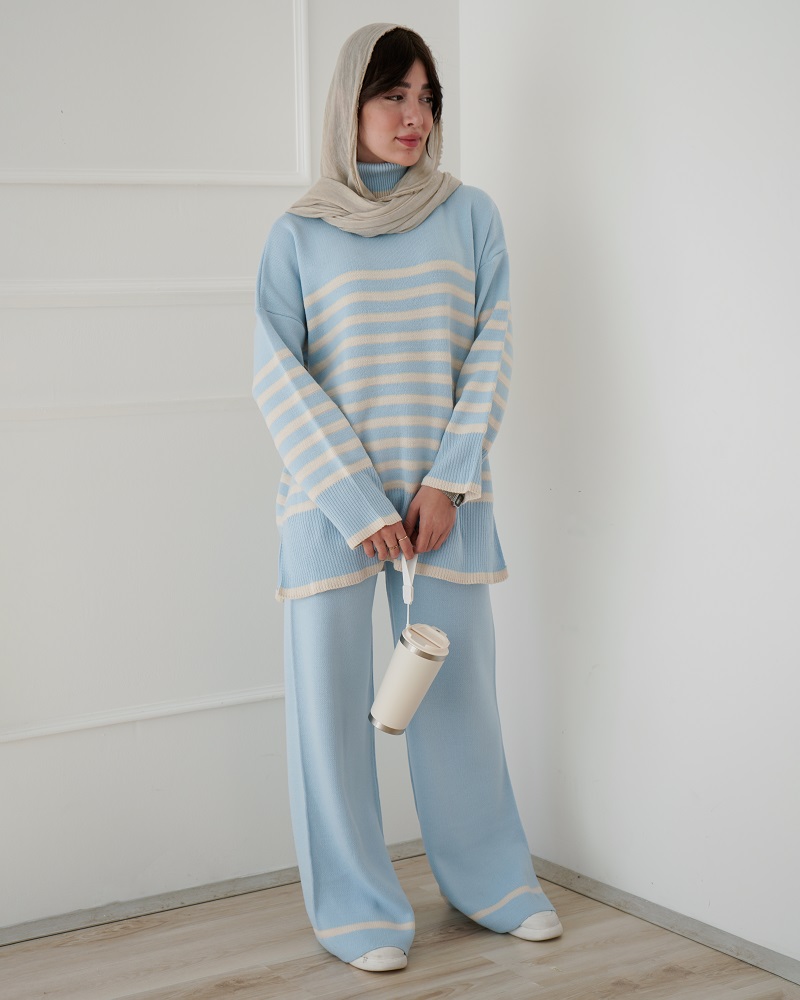 - توضیحات محصول: جنس ست، بافت می باشد. بلوز یقه اسکی بوده و کمر شلوار، تماما کشی است. ست، دارای کشسانی، بالایی می باشد.