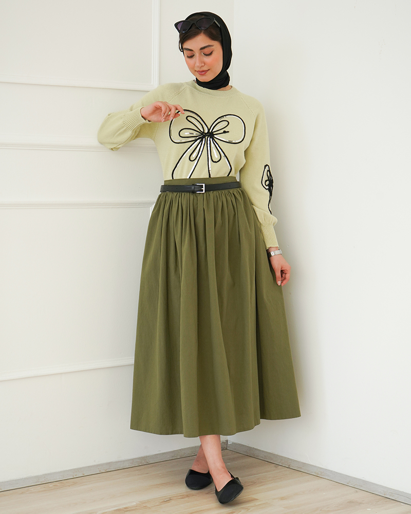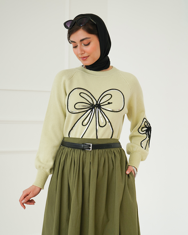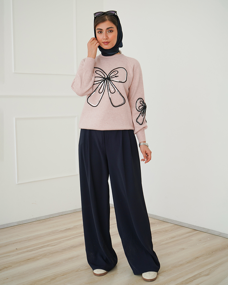 - توضیحات محصول: جنس بلوز، بافت لطبف گرم بالا است. بلوز، یقه گرد و آستین بلند می باشد. طرح های روی بلوز، اپلیکه طنابی و پولکی است. این محصول کشسانی بالایی دارد.