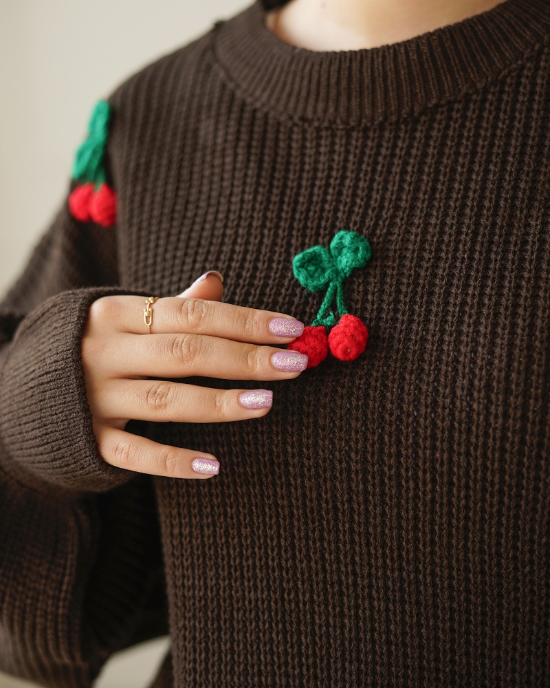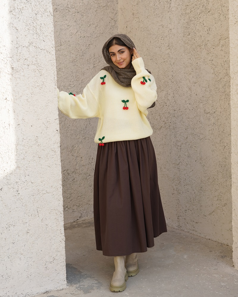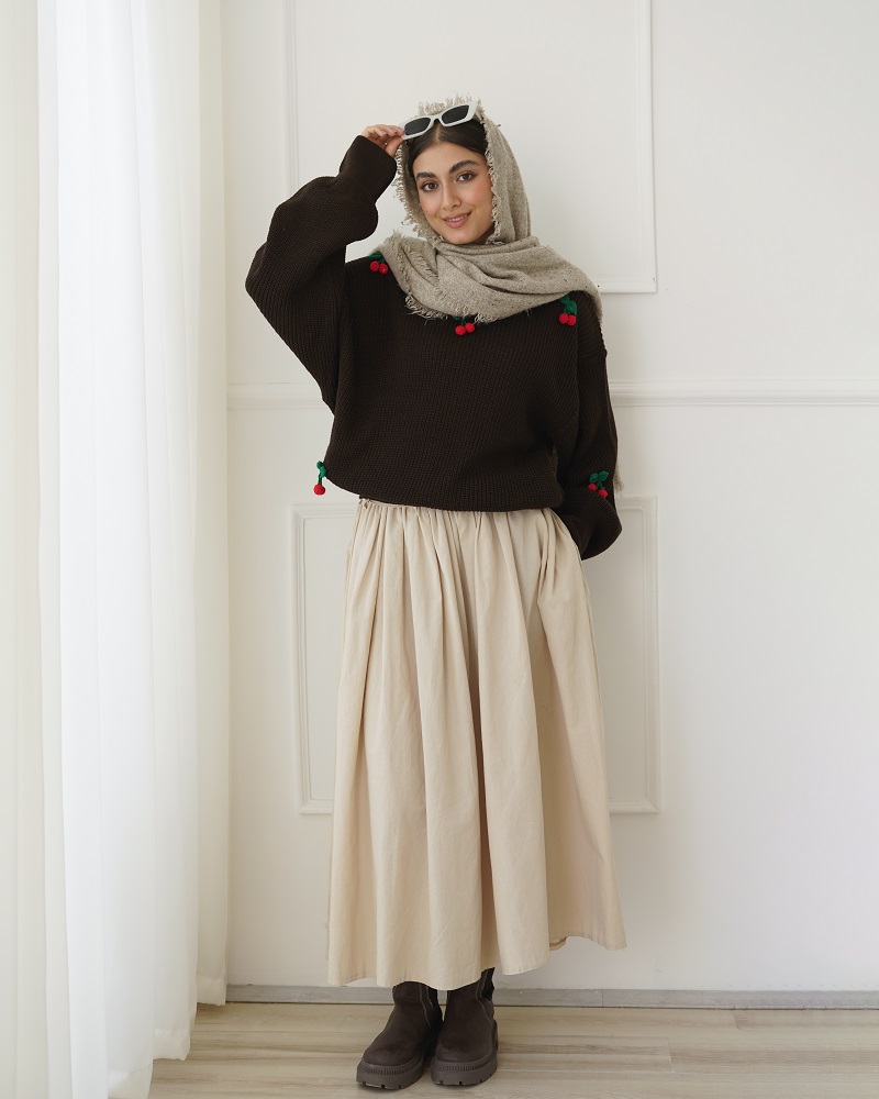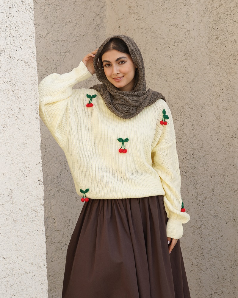 - توضیحات محصول: جنس بلوز بافت می باشد. بلوز یقه گرد و آستین بلند است. آلبالو های روی لباس برجسته می باشد.