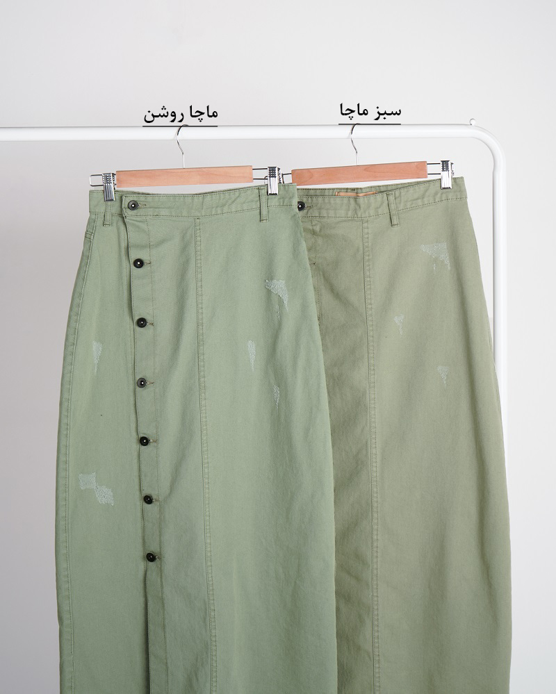 - توضیحات محصول: جنس دامن کتان می باشد. کمر دامن دکمه ای بوده و دامن فاقد کشسانی می باشد. این محصول دارای دو جیب کاربردی در قسمت پشت لباس بوده و دکمه های دامن تماما کاربردی می باشند. این محصول دارای پل کمربندمی باشد.