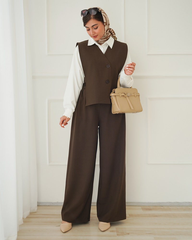 - توضیحات محصول: جنس ست فیونا می باشد. دکمه های وست کاربردی هستند. کمر شلوار پشت کشی و تنخور شلوار بگ می باشد. جلوی وست آستر کشی شده است.