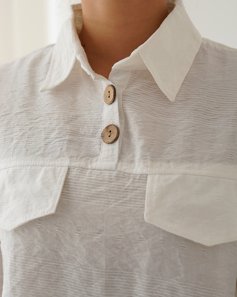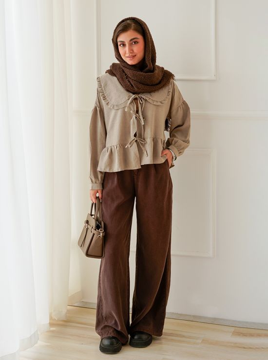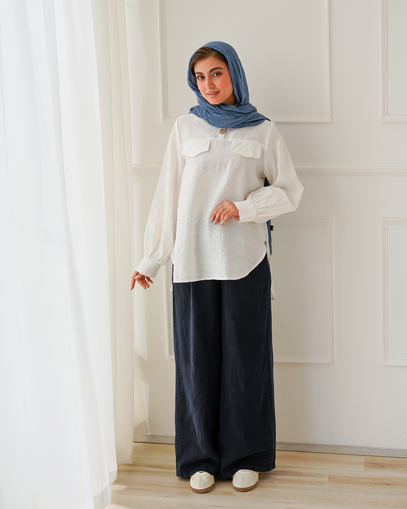 - توضیحات محصول: جنس شومیز، کتیبه است. شومیز جلو بسته می باشد. شومیز یقه مردانه و دکمه های یقه کاربردی هستند. جیب ها نما می باشد.