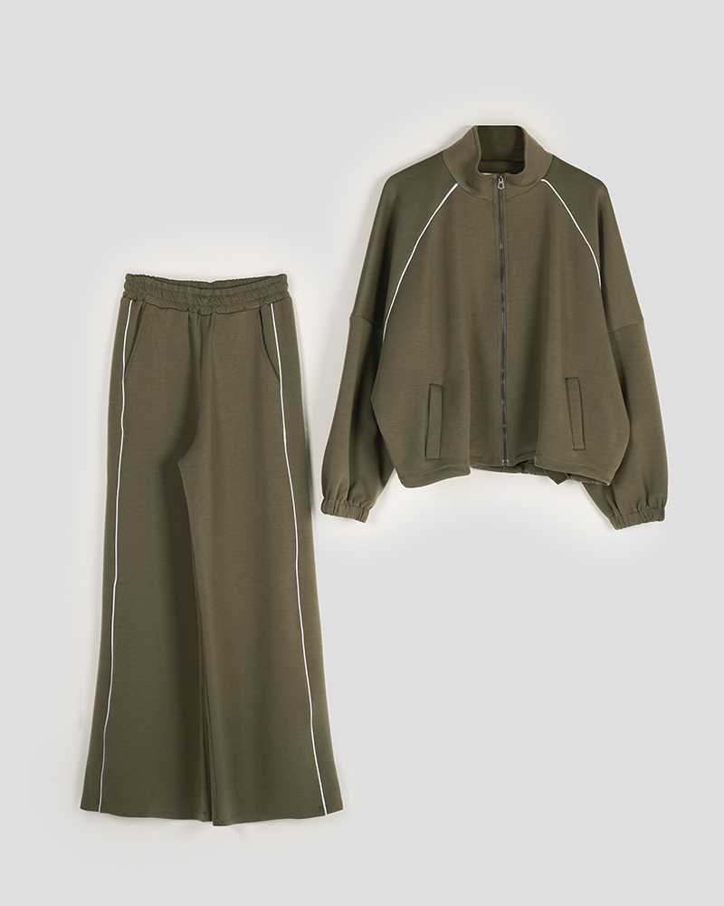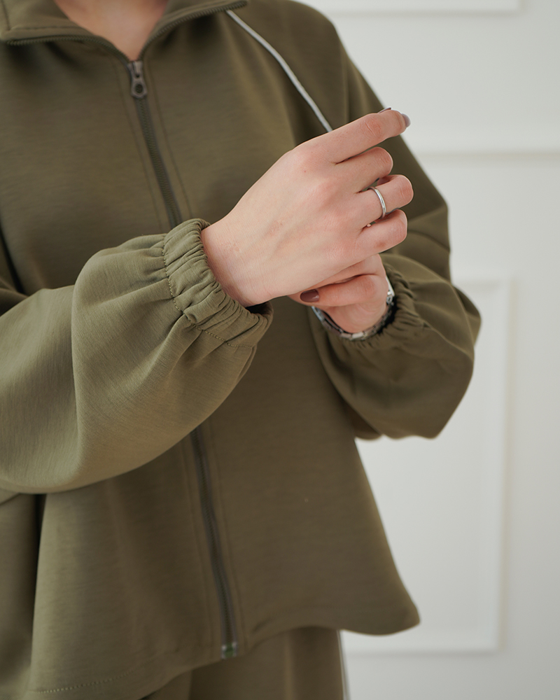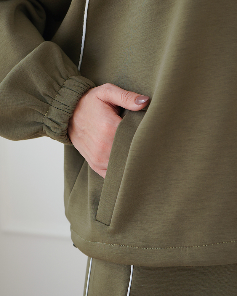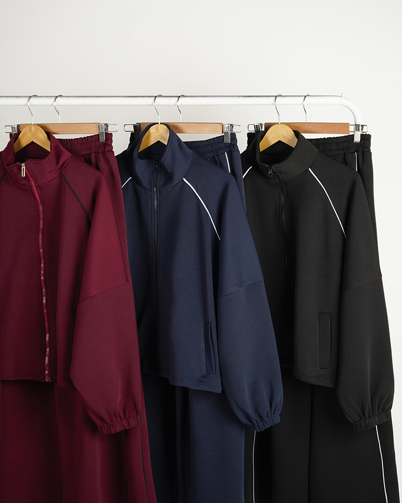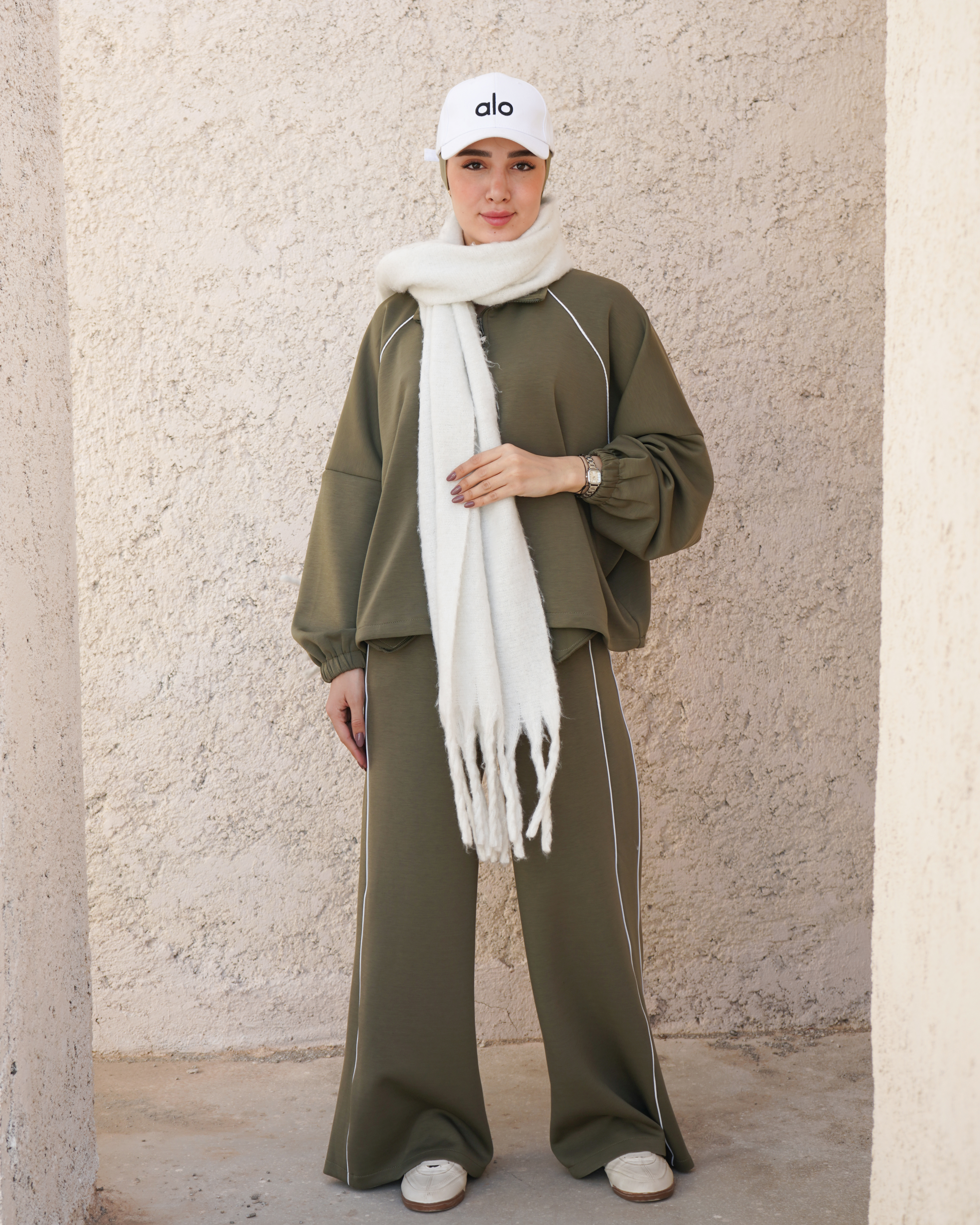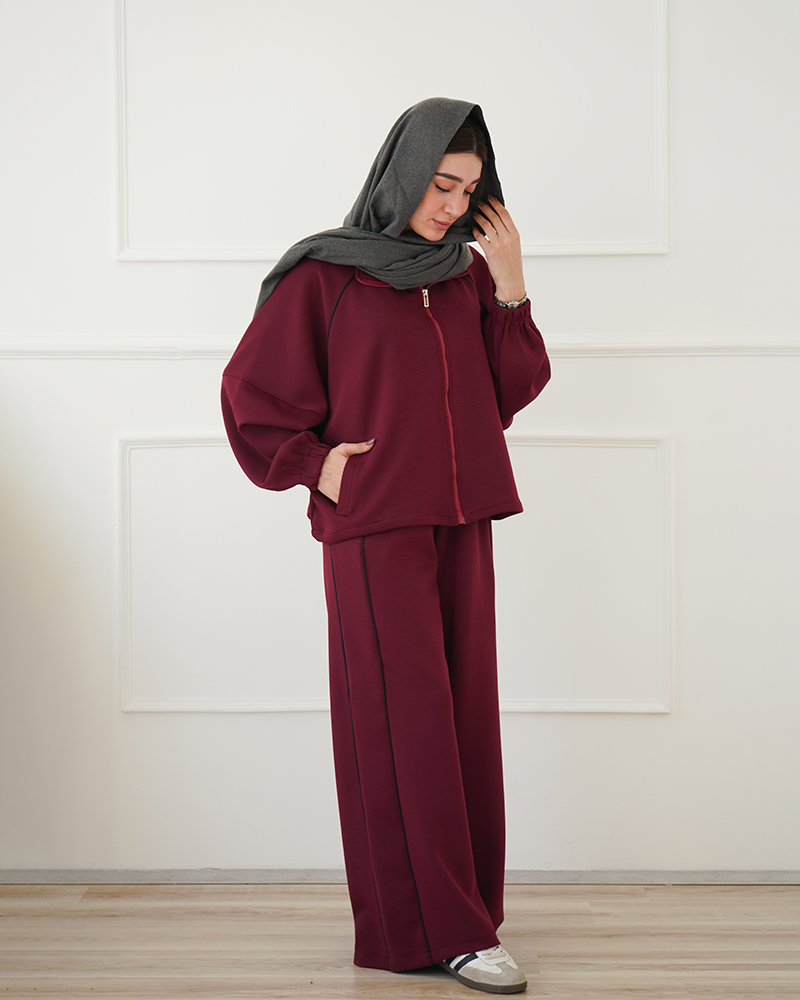 - توضیحات محصول: جنس ست اویشو می باشد. ست شامل یک سویشرت و یک شلوار است. سویشرت یقه مردانه و جلو زیپی است. قسمت سر آسیتن این محصول کشی بوده و جیب های سویشرت کاربردی هستند. دور کمر شلوار تماما کشی بوده و تنخور شلوار بگ می باشد. جیب های شلوار کاربردی هستند.
