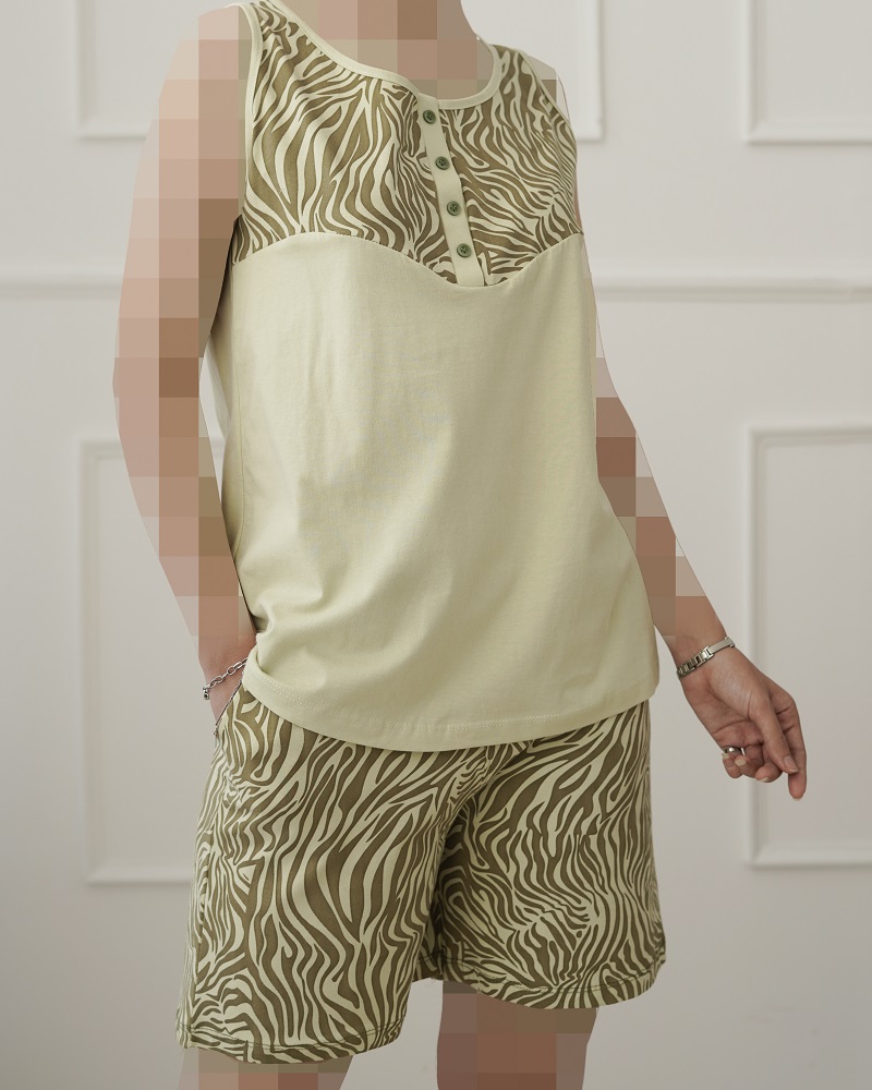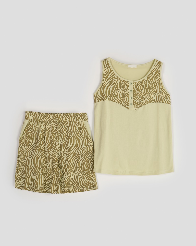 - توضیحات محصول: جنس ست نخ و پنبه طرح دار می باشد. تاپ آستین حلقه ای و یقه گرد می باشد. کمر شورت این محصول تماما کشی بوده و شورتک دارای دو جیب کاربردی است. ست دارای کشسانی بالا و خنک و لطیف مناسب استفاده روزمره می باشد.