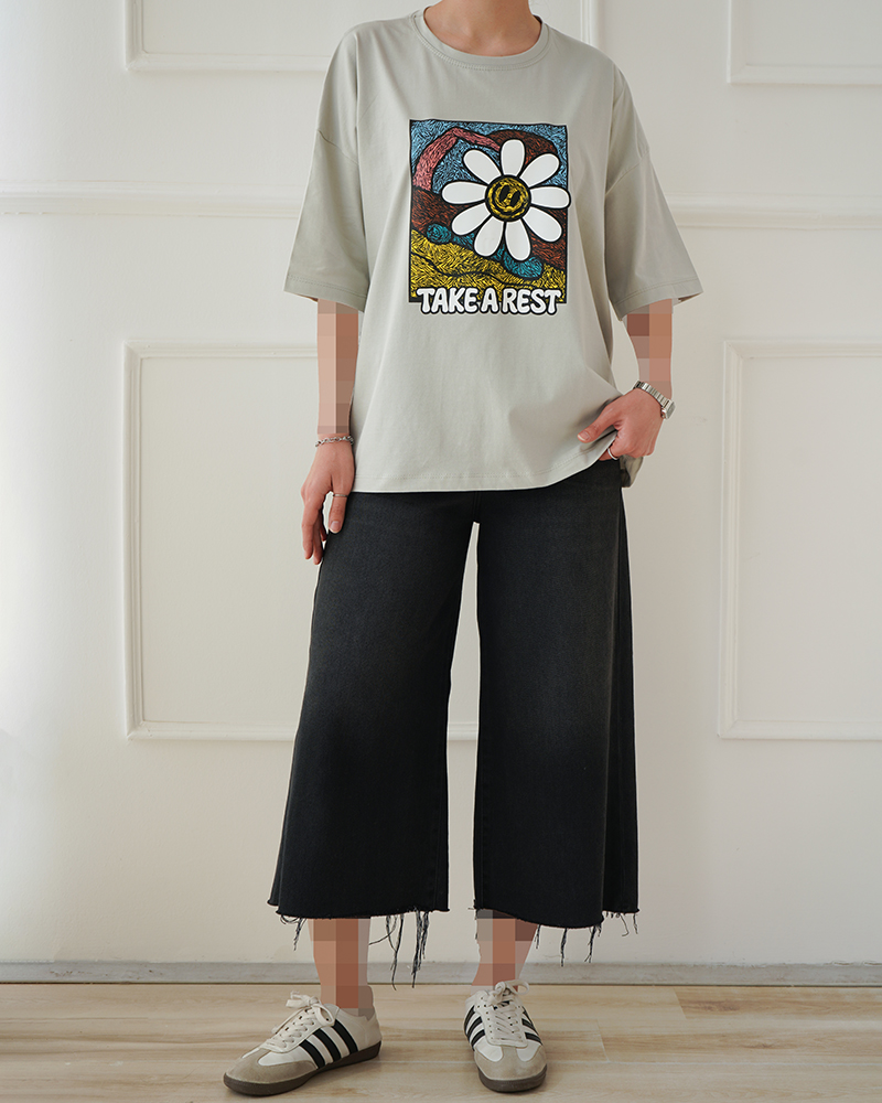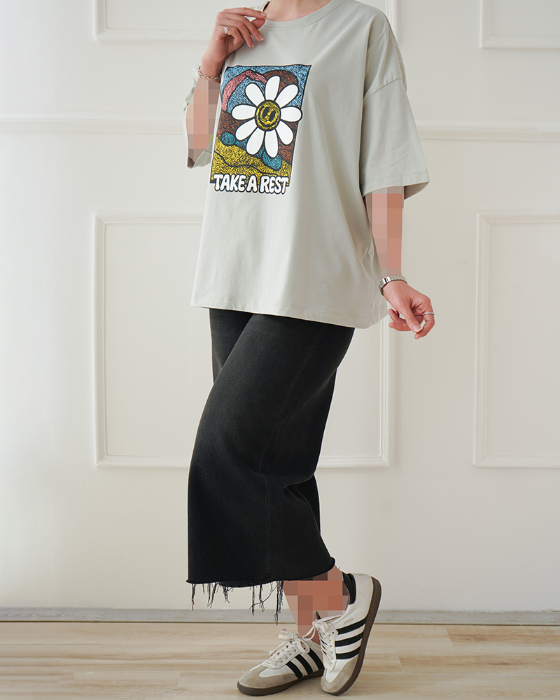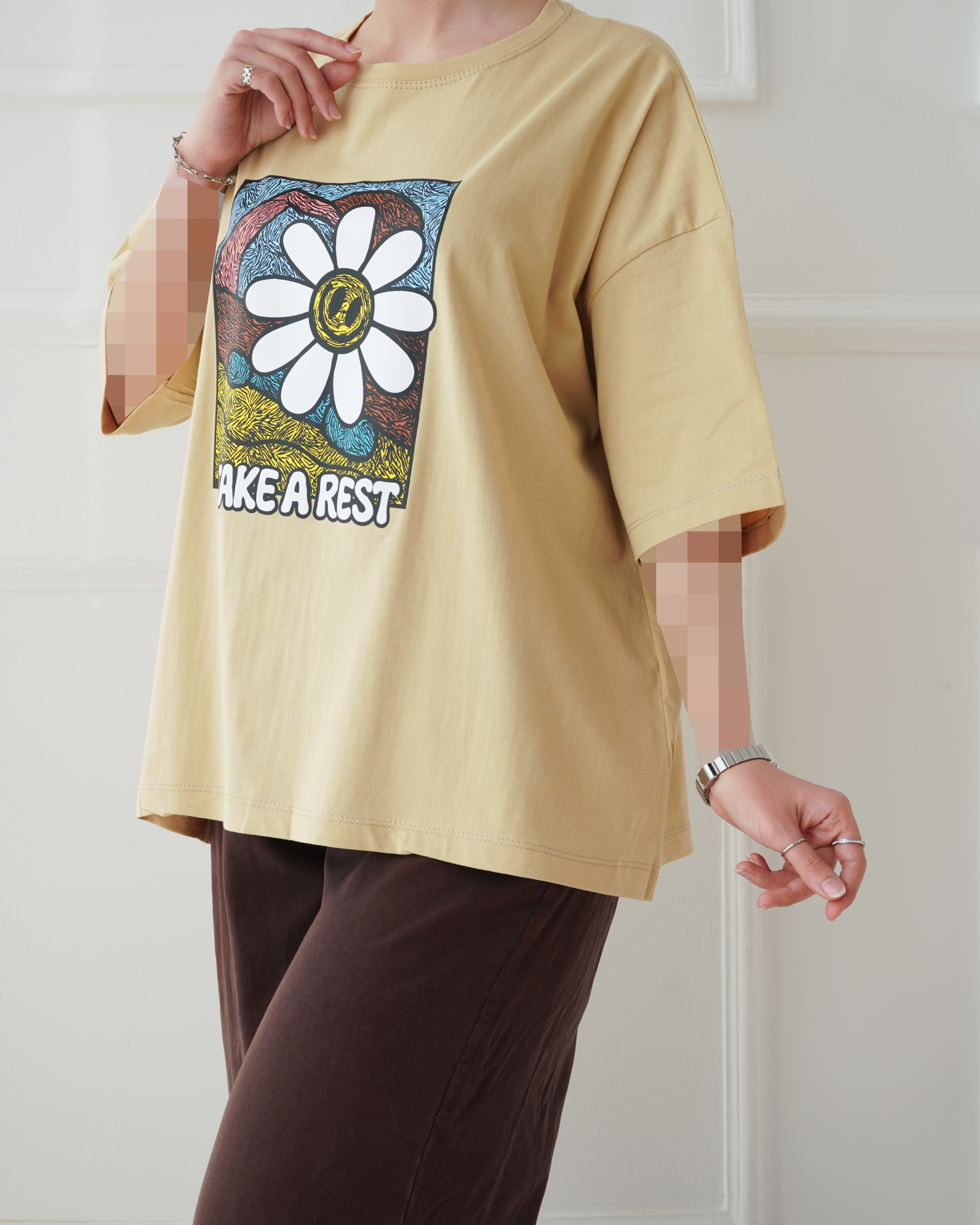 - توضیحات محصول: جنس تیشرت نخ و پنبه می باشد. تیشرت یقه گرد و آستین کوتاه می باشد. طرح های روی تیشرت چاپی است. تنخور تیشرت باکسی است. این محصول بسیار نرم و لطیف و خنک همراه با کشسانی مناسب استفاده روزمره می باشد.