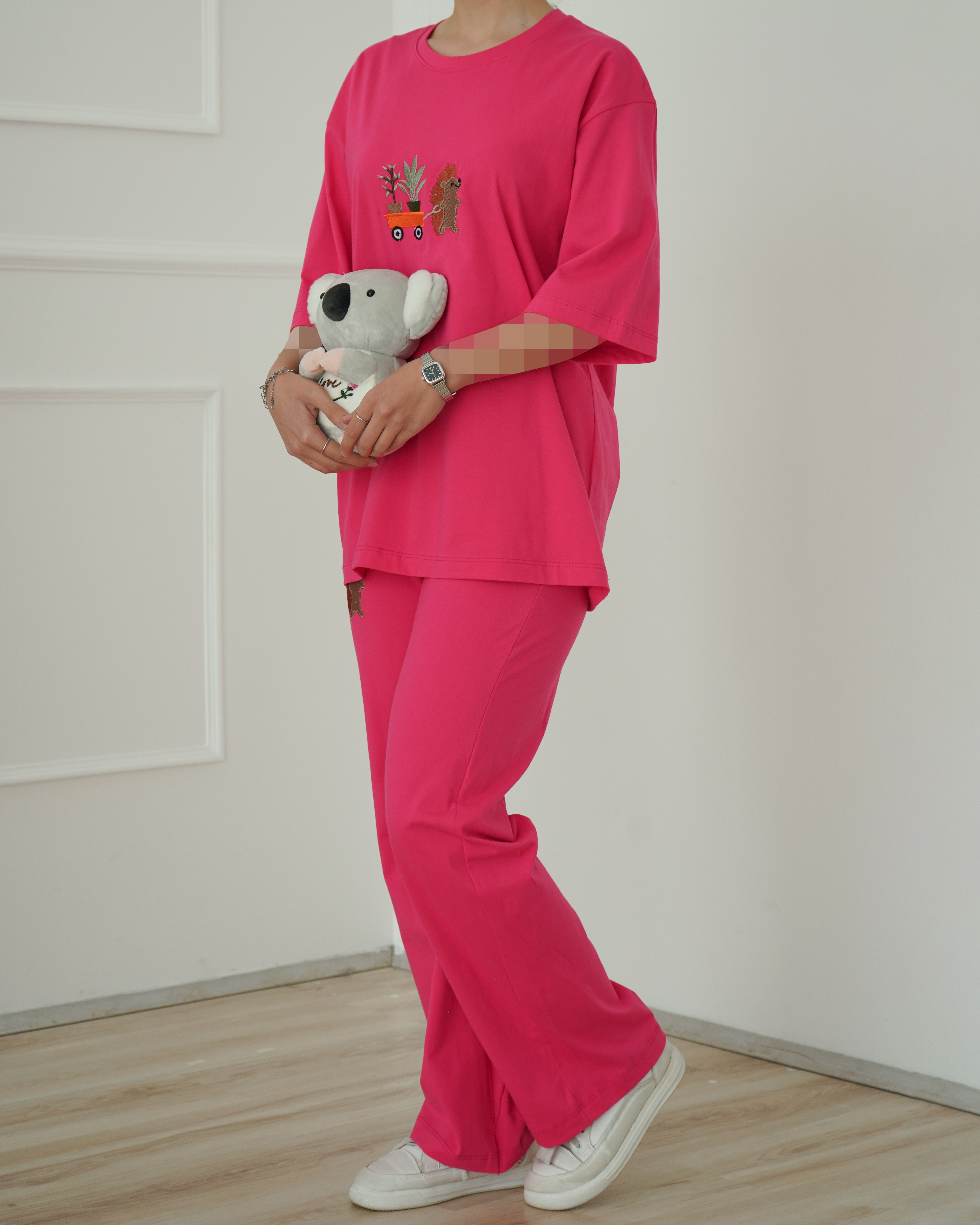 - توضیحات محصول: جنس تیشرت و شلوار نخ و پنبه می باشد. تیشرت یقه گرد و آستین کوتاه می باشد. طرح های روی ست گلدوزی شده هستند. کمر شلوار تماما کشی بوده و بند دور کمر کاربردی است.