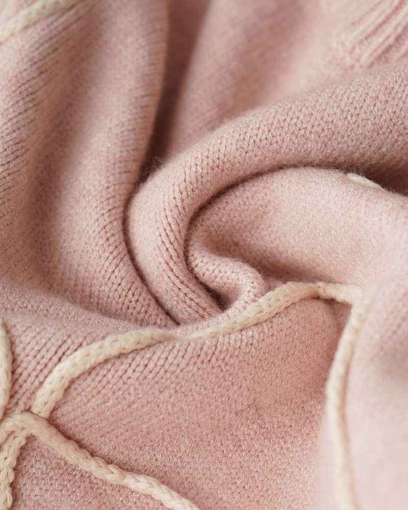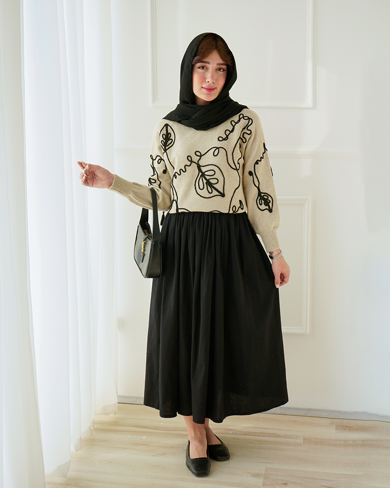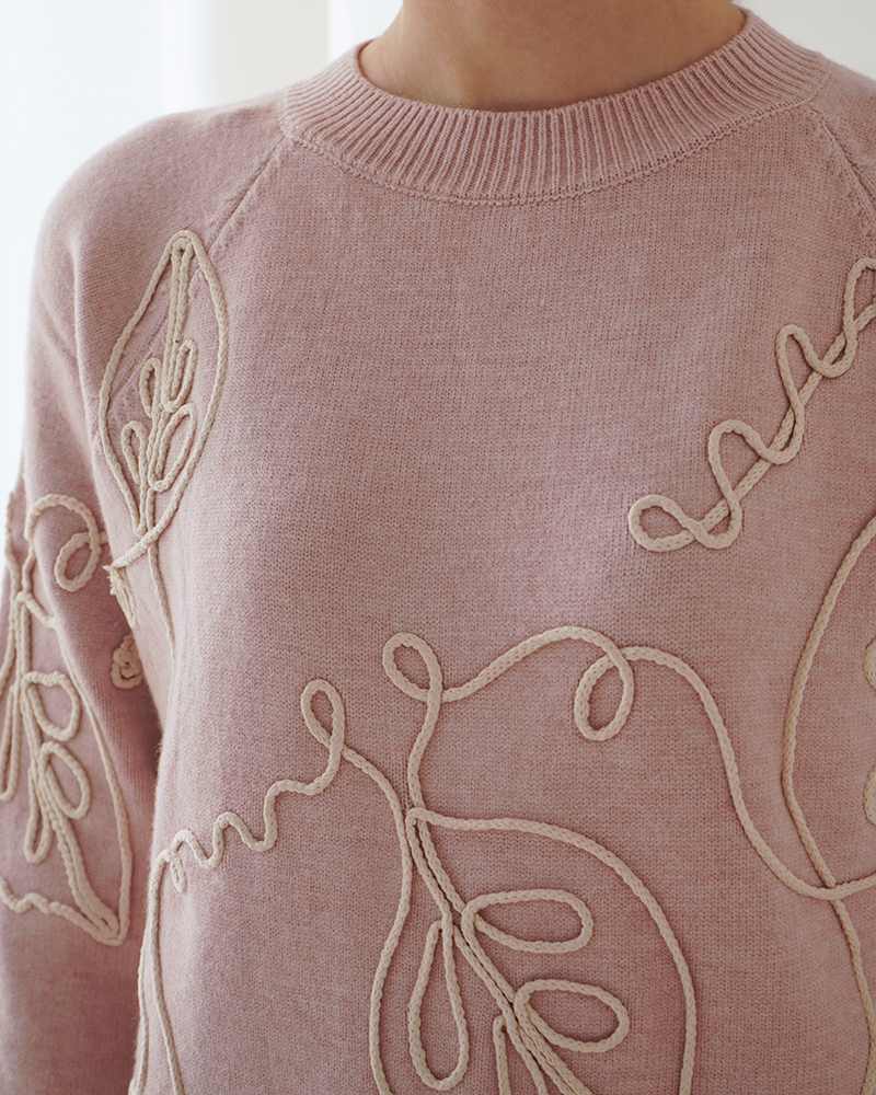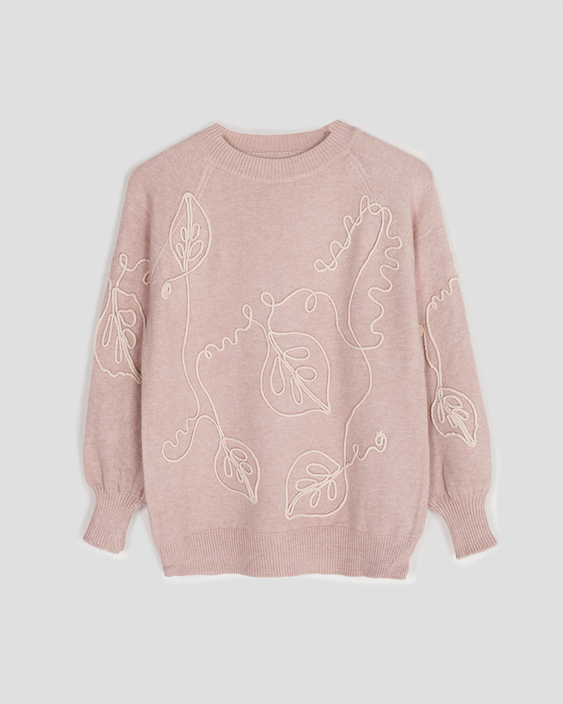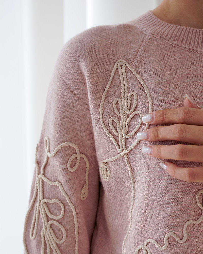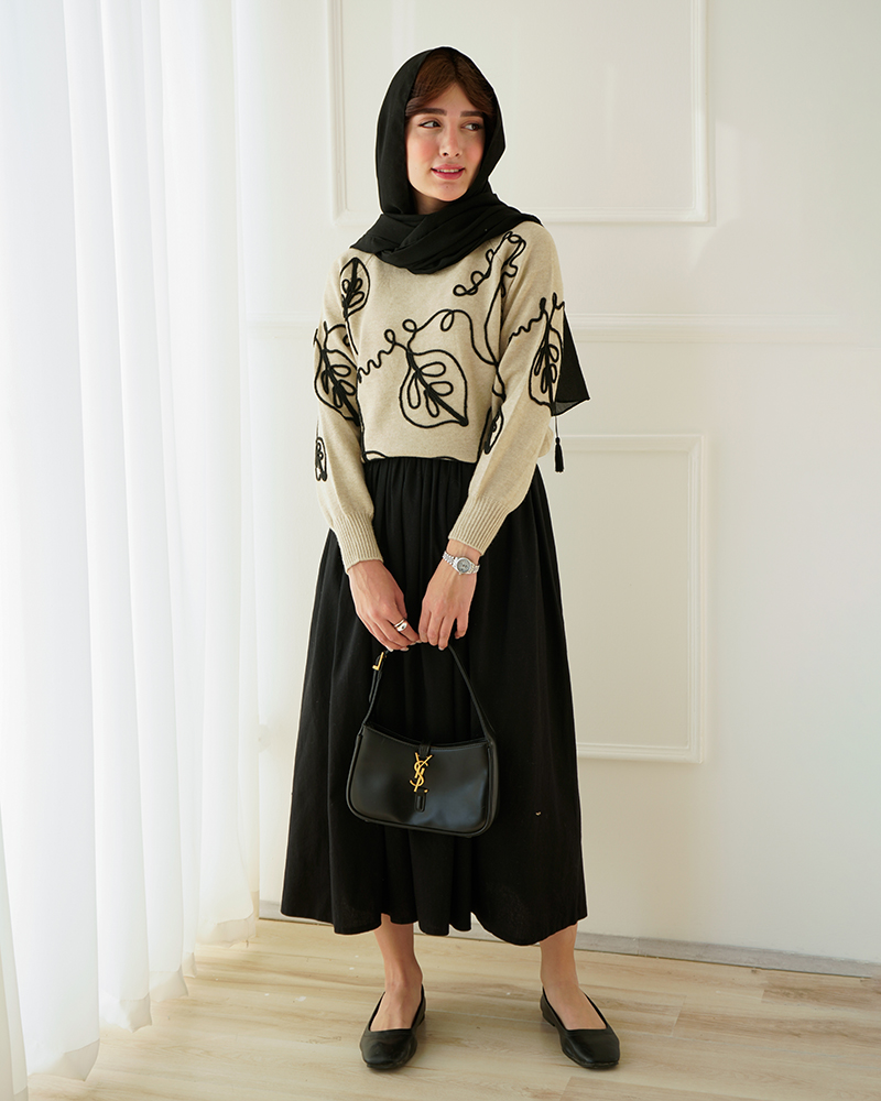 - توضیحات محصول: جنس بلوز، بافت است. بلوز، یقه گرد و آستین بلند می باشد. طرح های روی بلوز، اپلیکه طنابی است. این محصول کشسانی بالایی دارد.