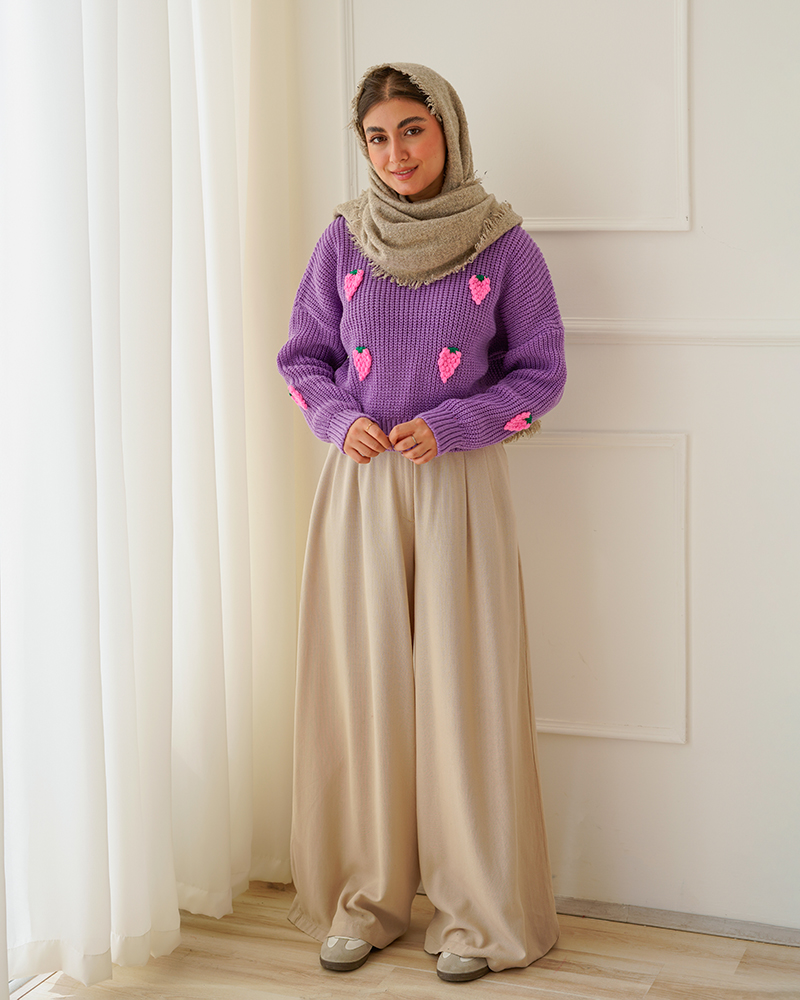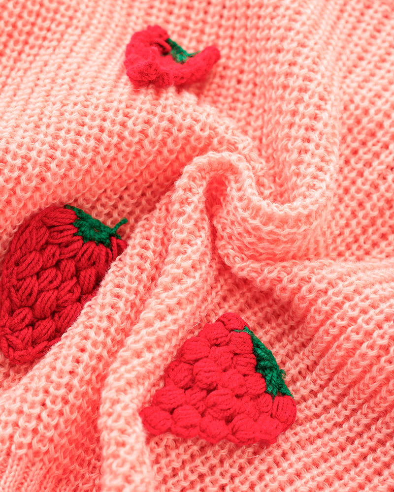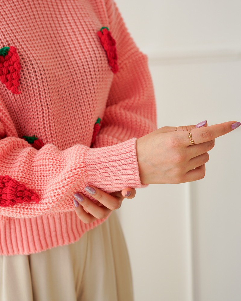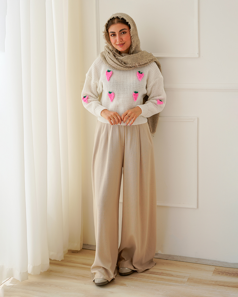 - توضیحات محصول: جنس بلوز بافت می باشد. بلوز یقه گرد و آستین بلند است. توت فرنگی های روی لباس برجسته می باشد.