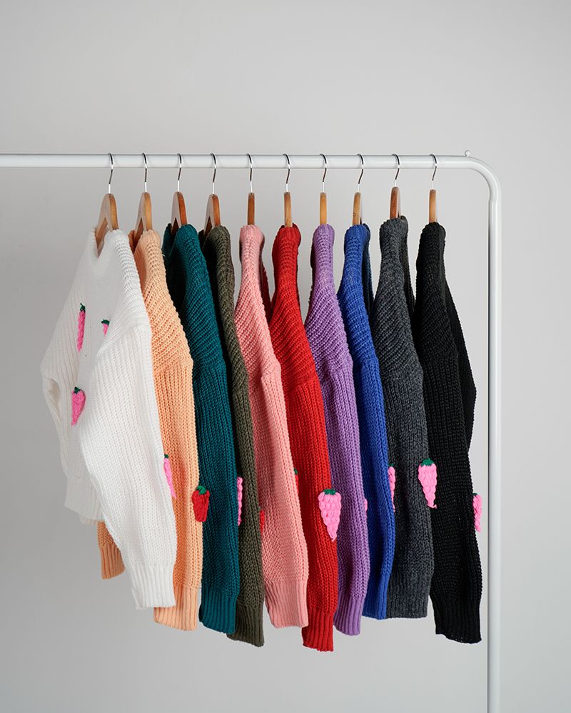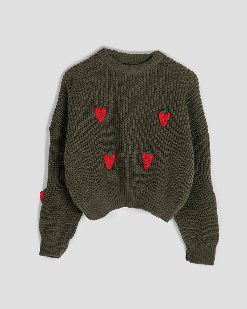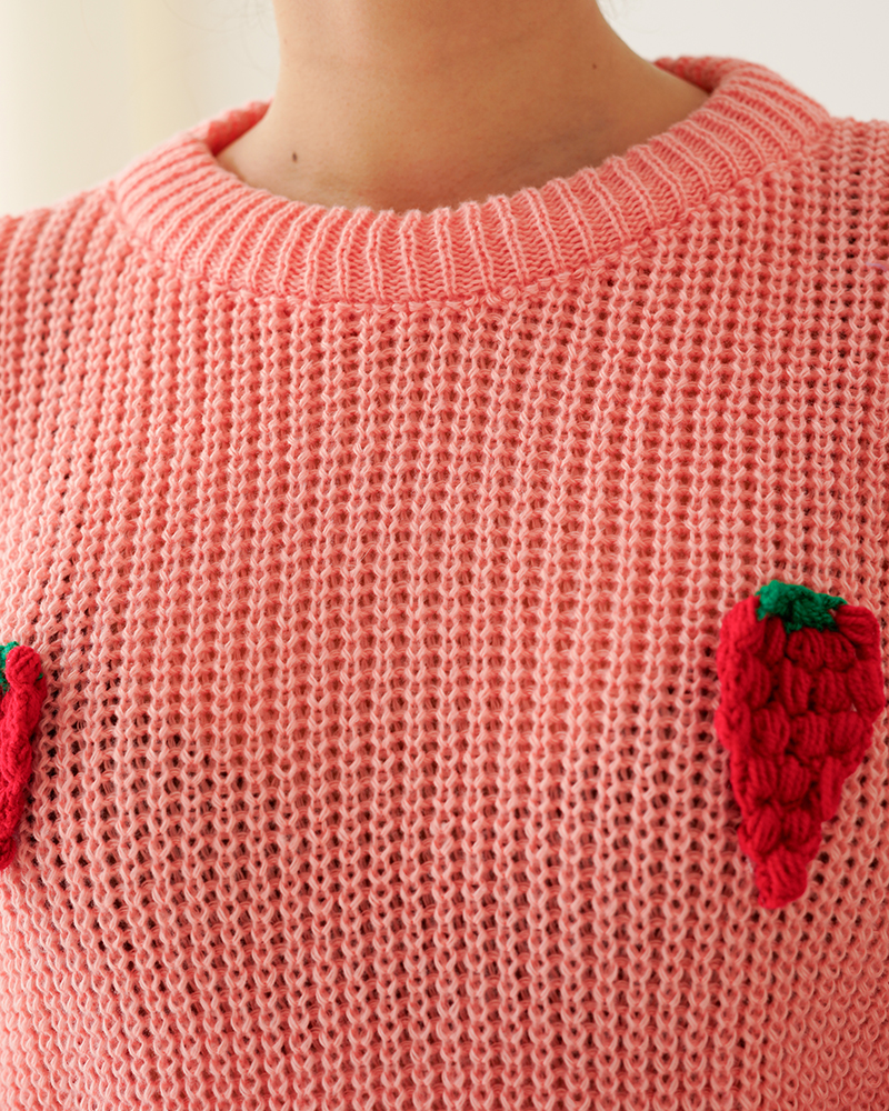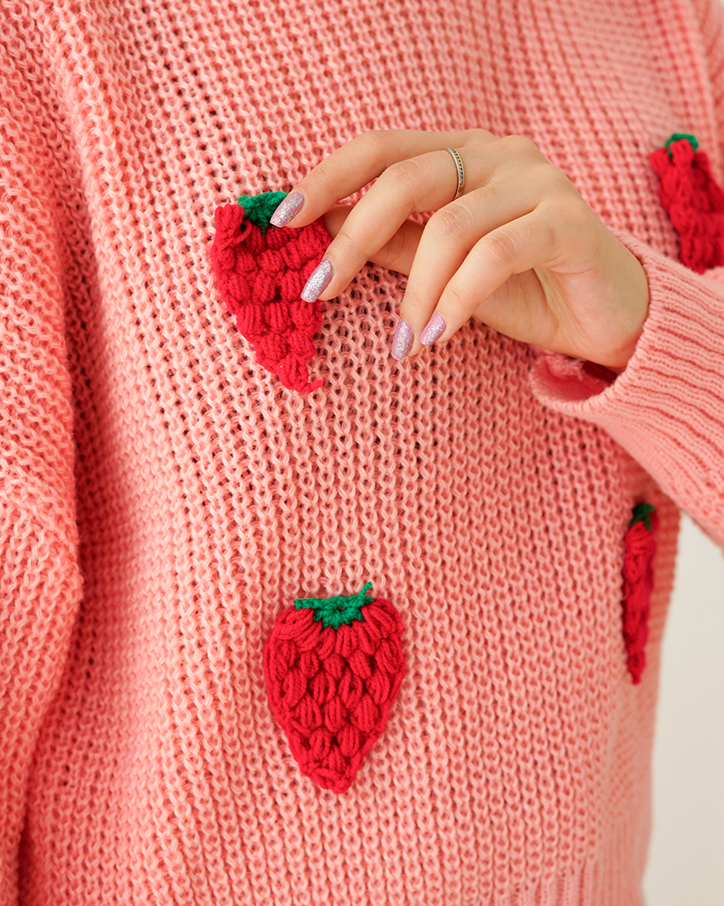 - توضیحات محصول: جنس بلوز بافت می باشد. بلوز یقه گرد و آستین بلند است. توت فرنگی های روی لباس برجسته می باشد.