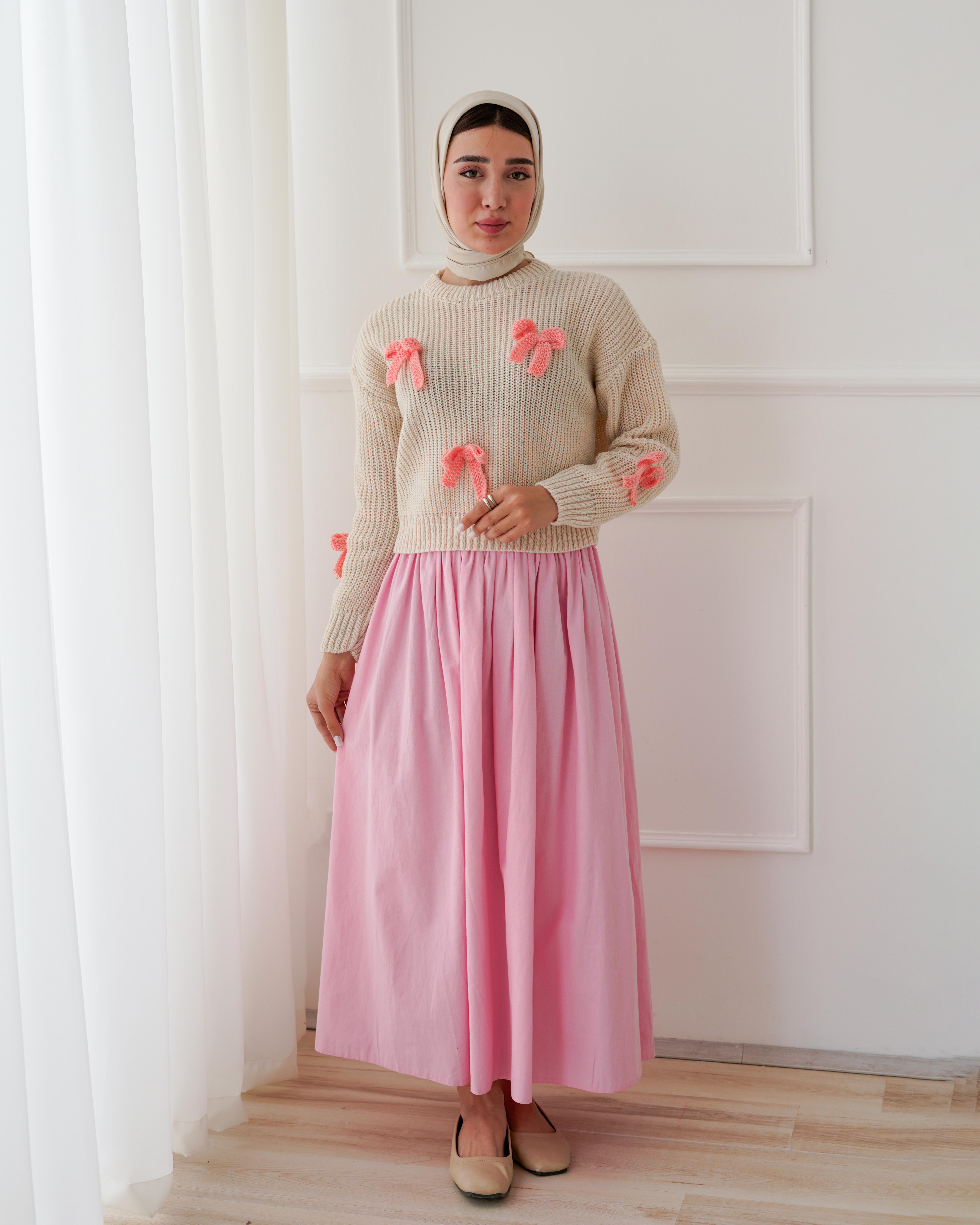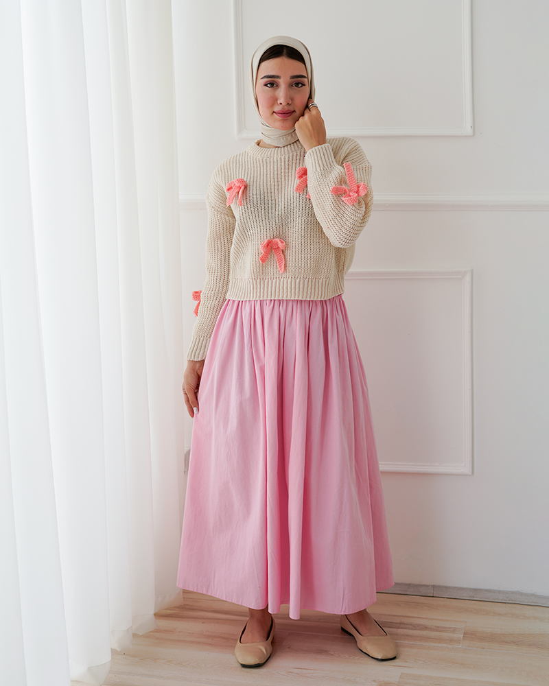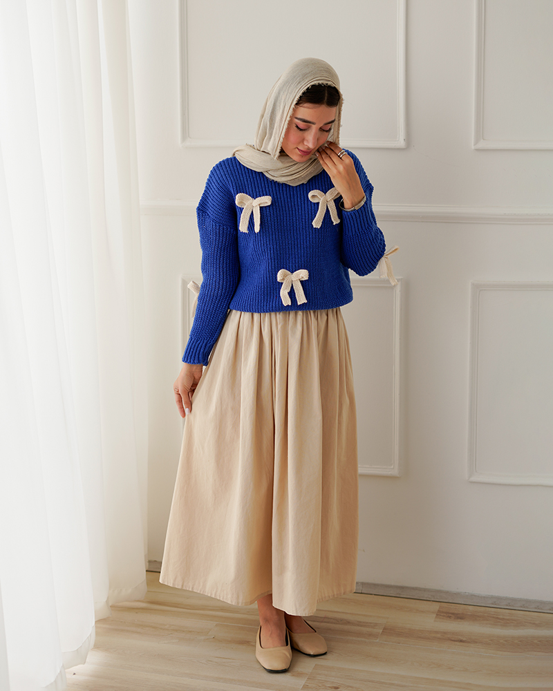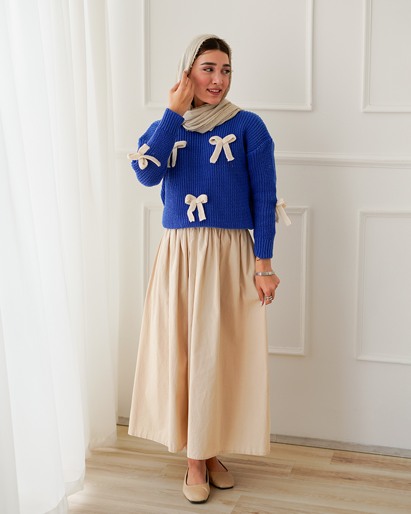 - توضیحات محصول: جنس بلوز بافت می باشد. بلوز یقه گرد و آستین بلند است. پاپیون های روی لباس چسبی می باشد.رنگ پاپیون های بلوز آبی شالی به صورت رندوم ارسال می گردد.