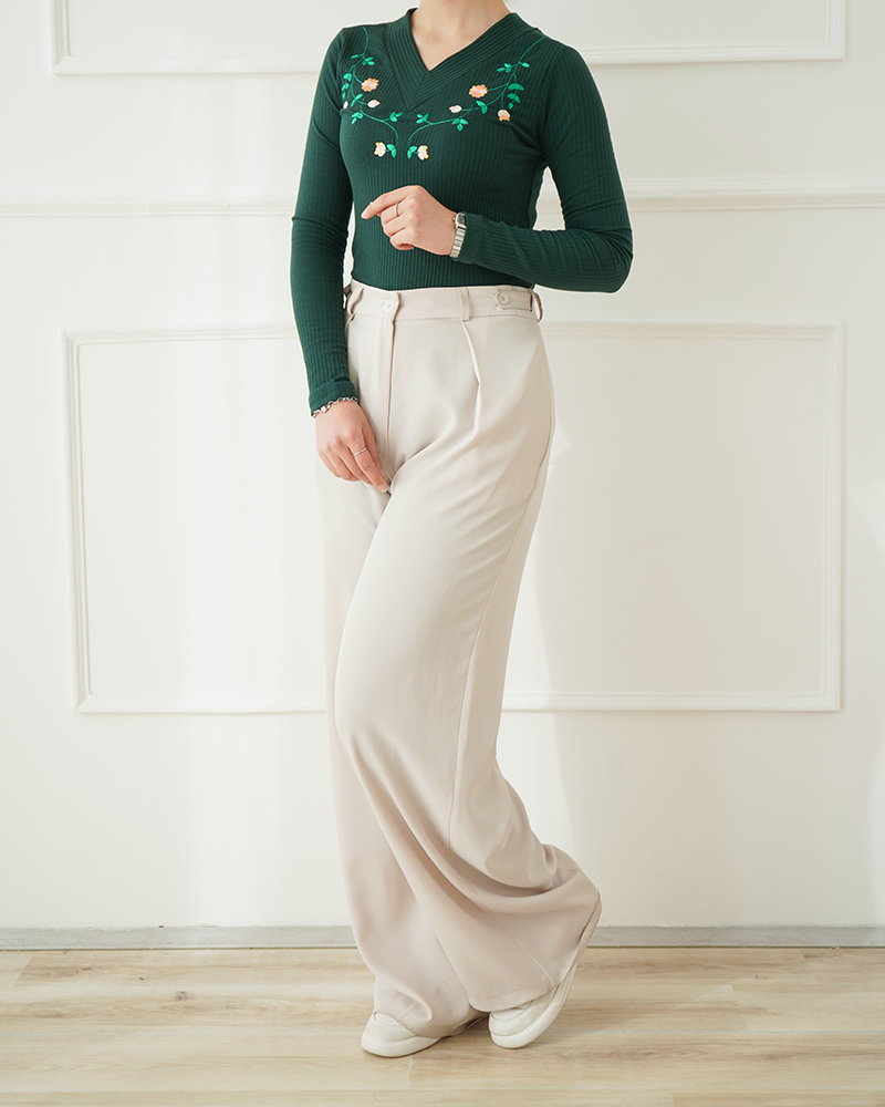 - توضیحات محصول: جنس بلوز، نخ پنبه کبریتی است. بلوز، یقه هفت و آستین بلند می باشد. طرح های روی لباس، گلدوزی است. این محصول کشسانی بالایی دارد.