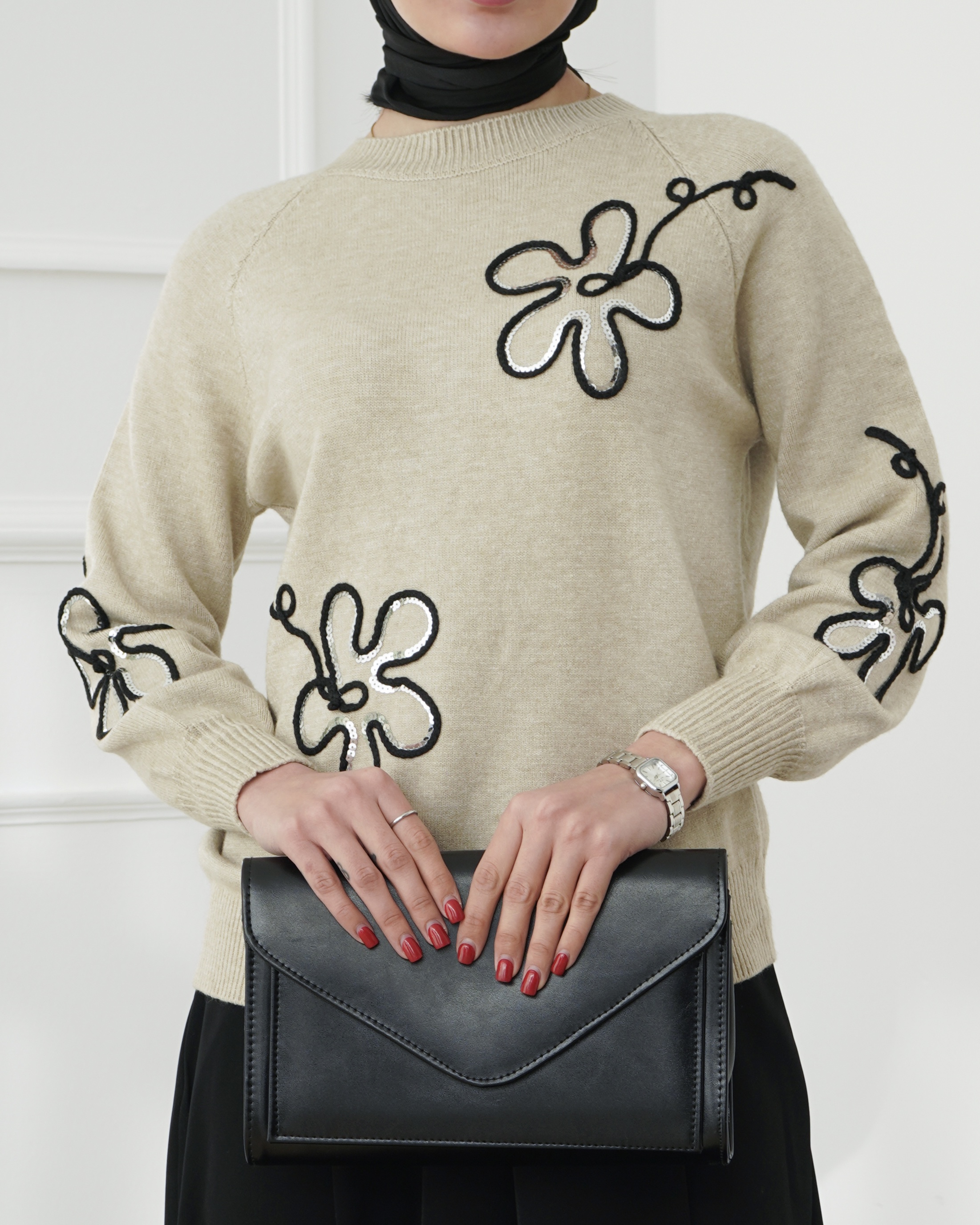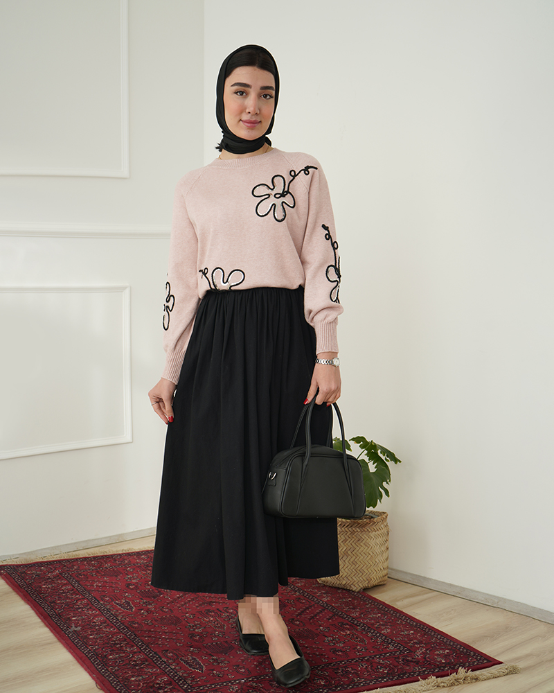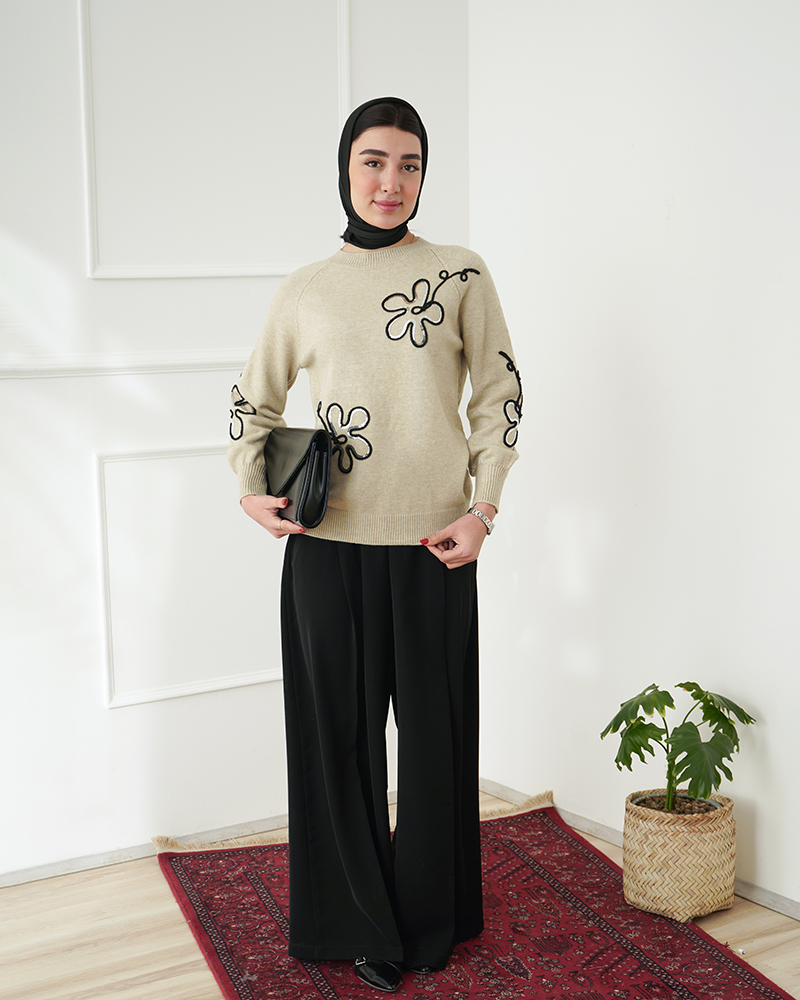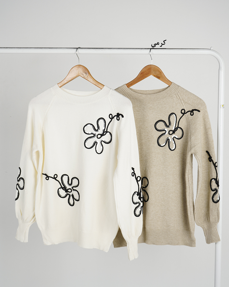 - توضیحات محصول: جنس بلوز، بافت لطبف گرم بالا است. بلوز، یقه گرد و آستین بلند می باشد. طرح های روی بلوز، اپلیکه طنابی و پولکی است. این محصول کشسانی بالایی دارد.