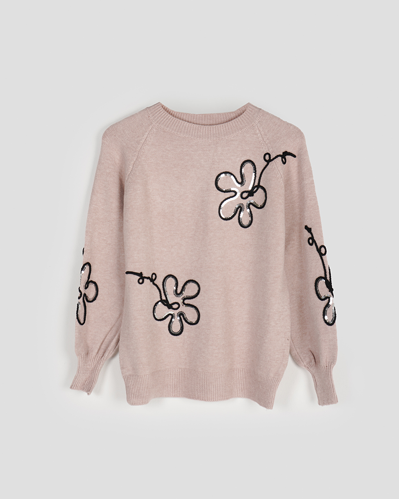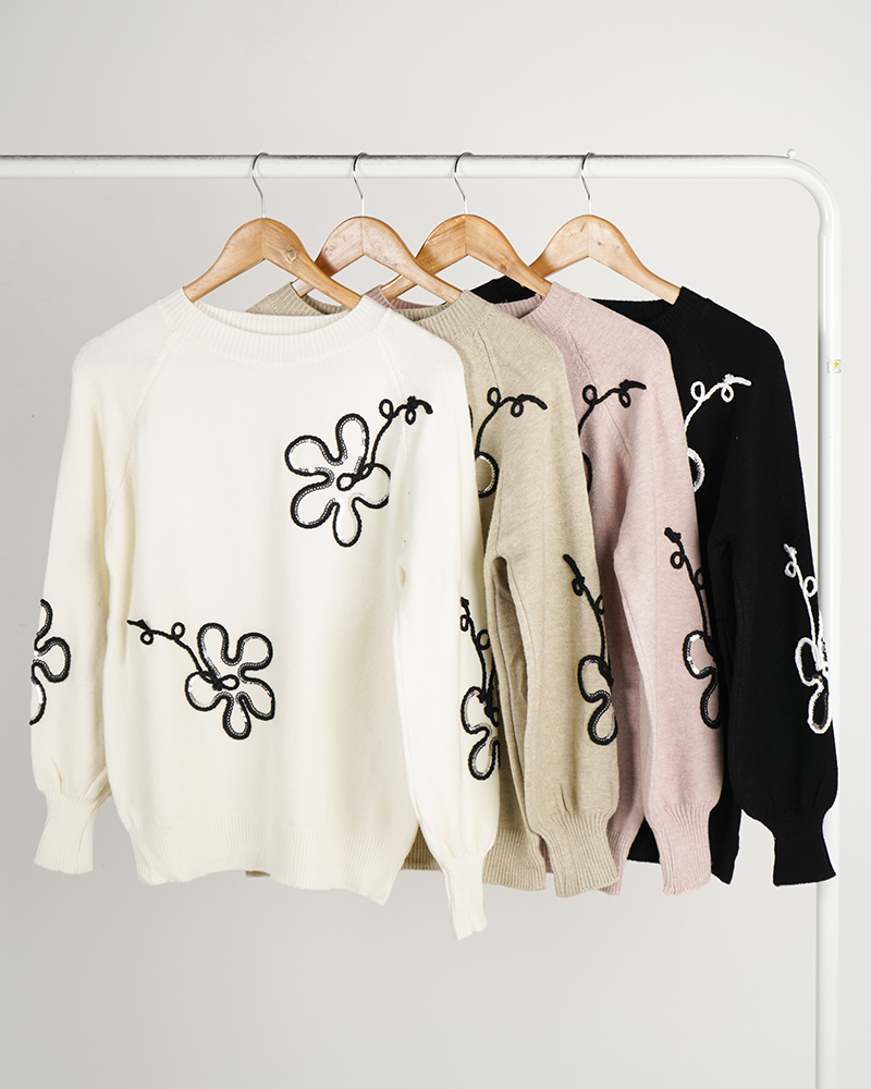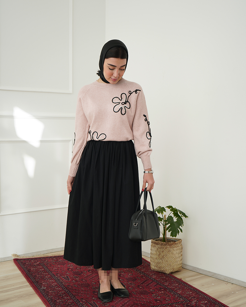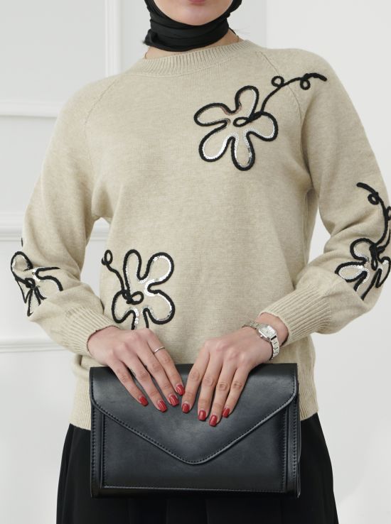 - توضیحات محصول: جنس بلوز، بافت لطبف گرم بالا است. بلوز، یقه گرد و آستین بلند می باشد. طرح های روی بلوز، اپلیکه طنابی و پولکی است. این محصول کشسانی بالایی دارد.
