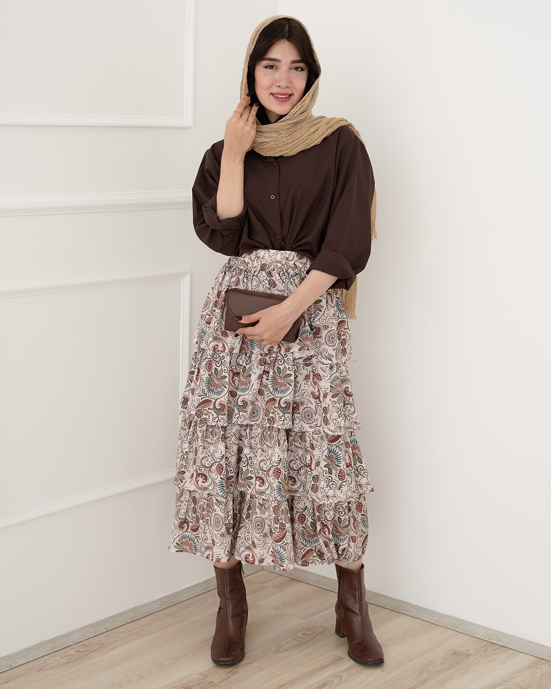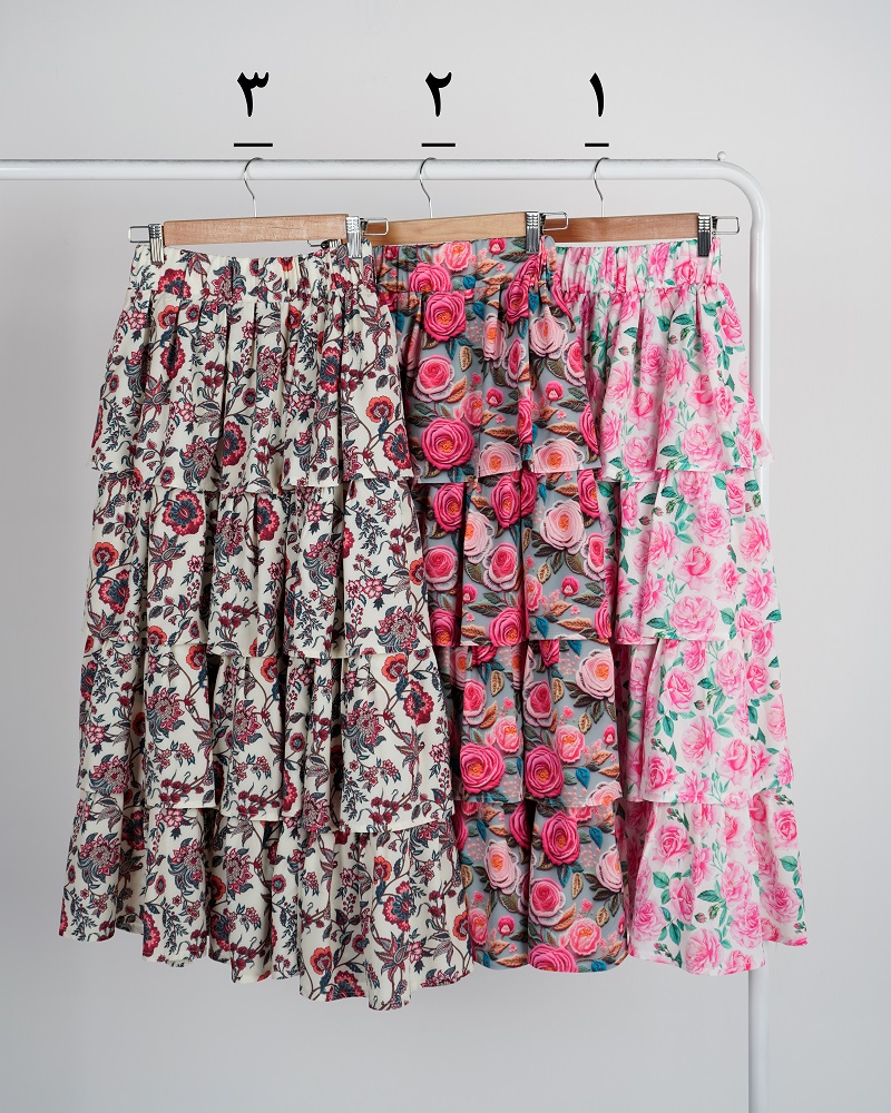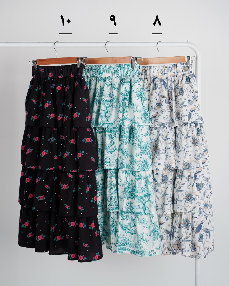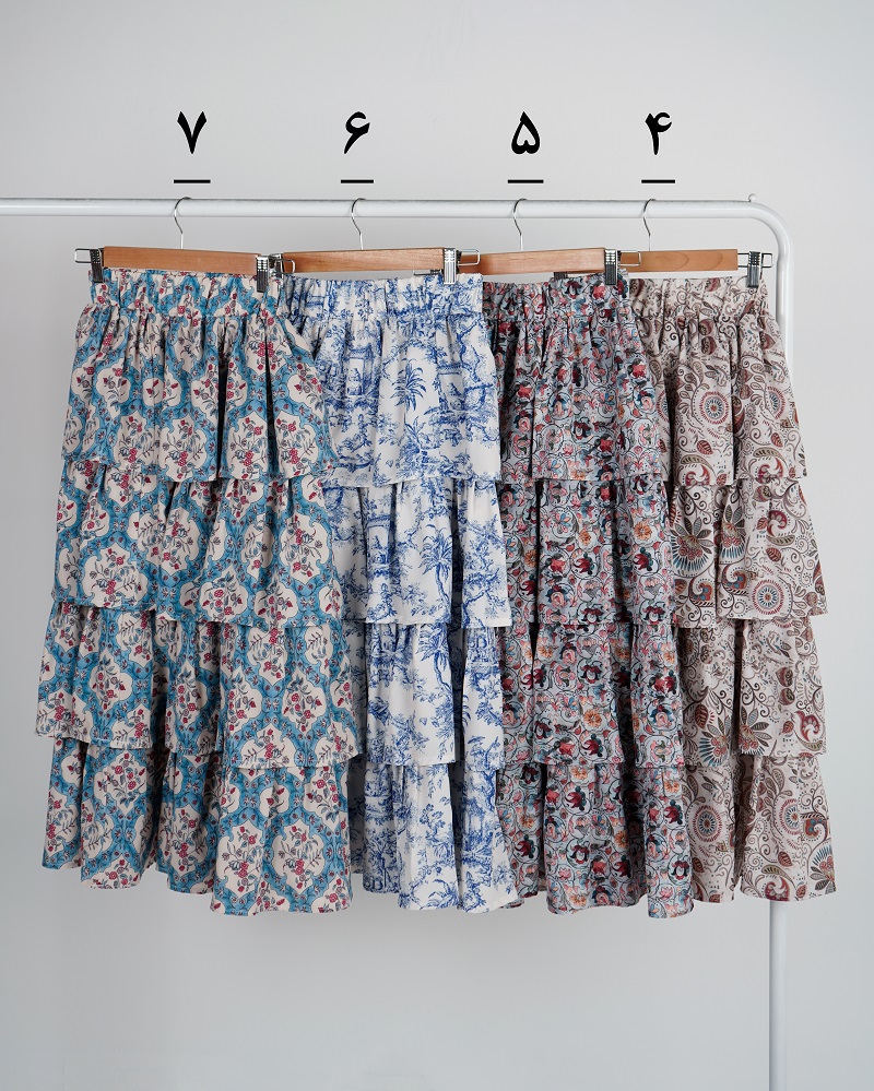 - توضیحات محصول: جنس دامن، بوگاتی می باشد. کمر دامن تمام کشی می باشد. دامن طبقه ای است.