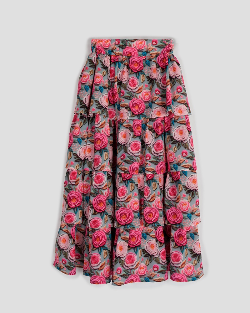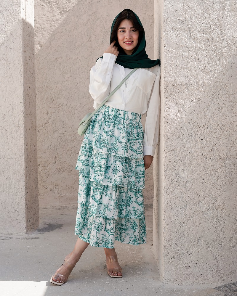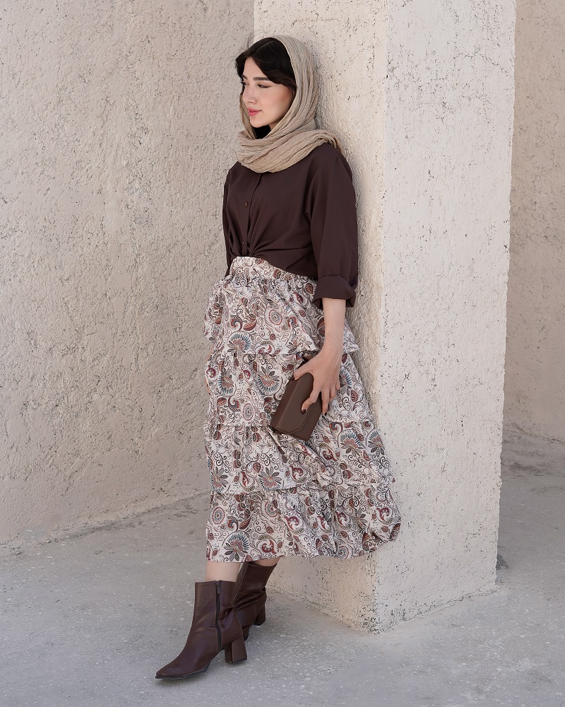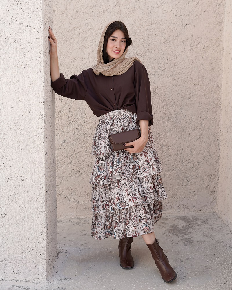 - توضیحات محصول: جنس دامن، بوگاتی می باشد. کمر دامن تمام کشی می باشد. دامن طبقه ای است.