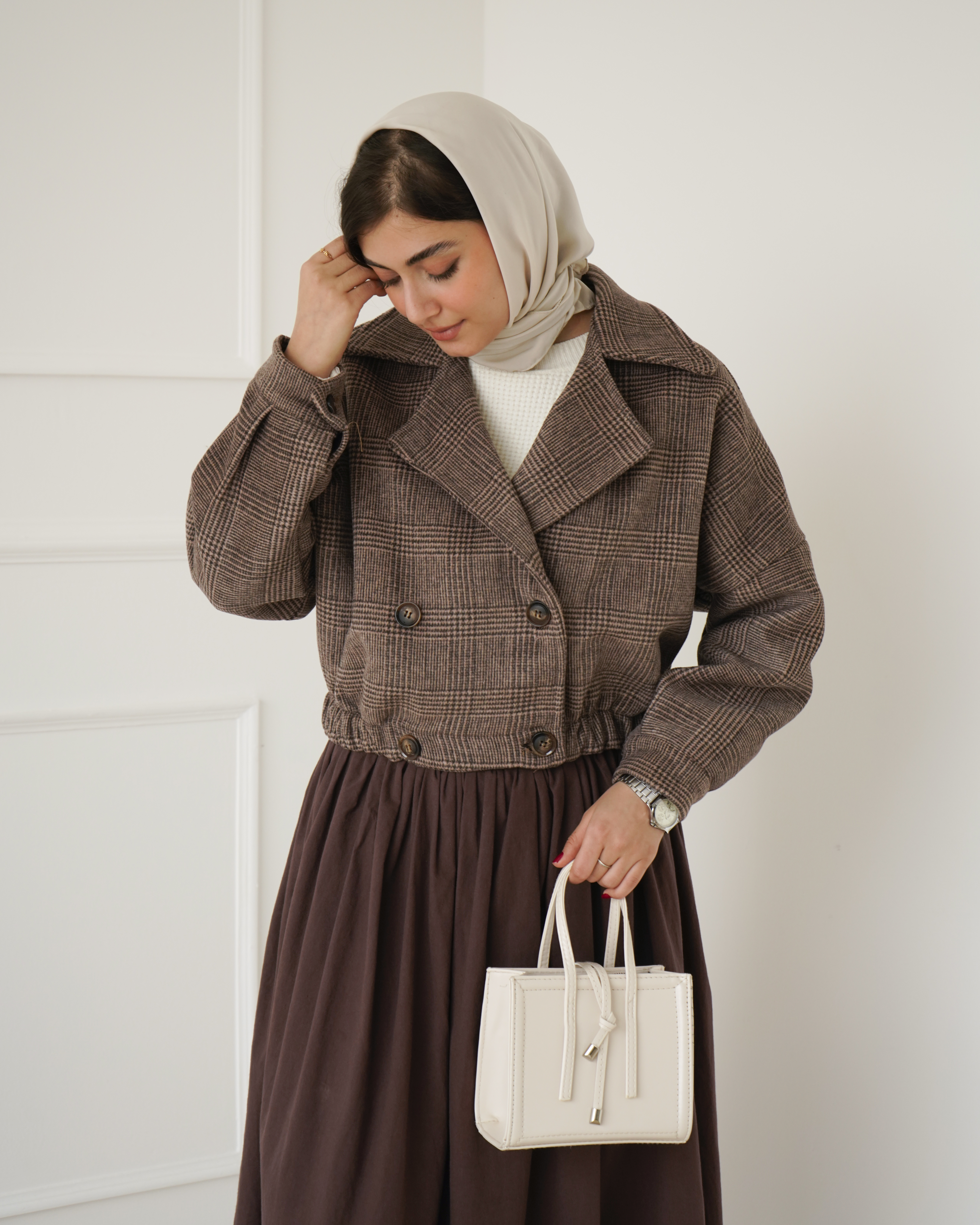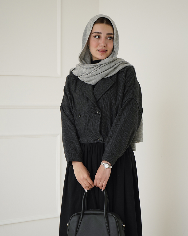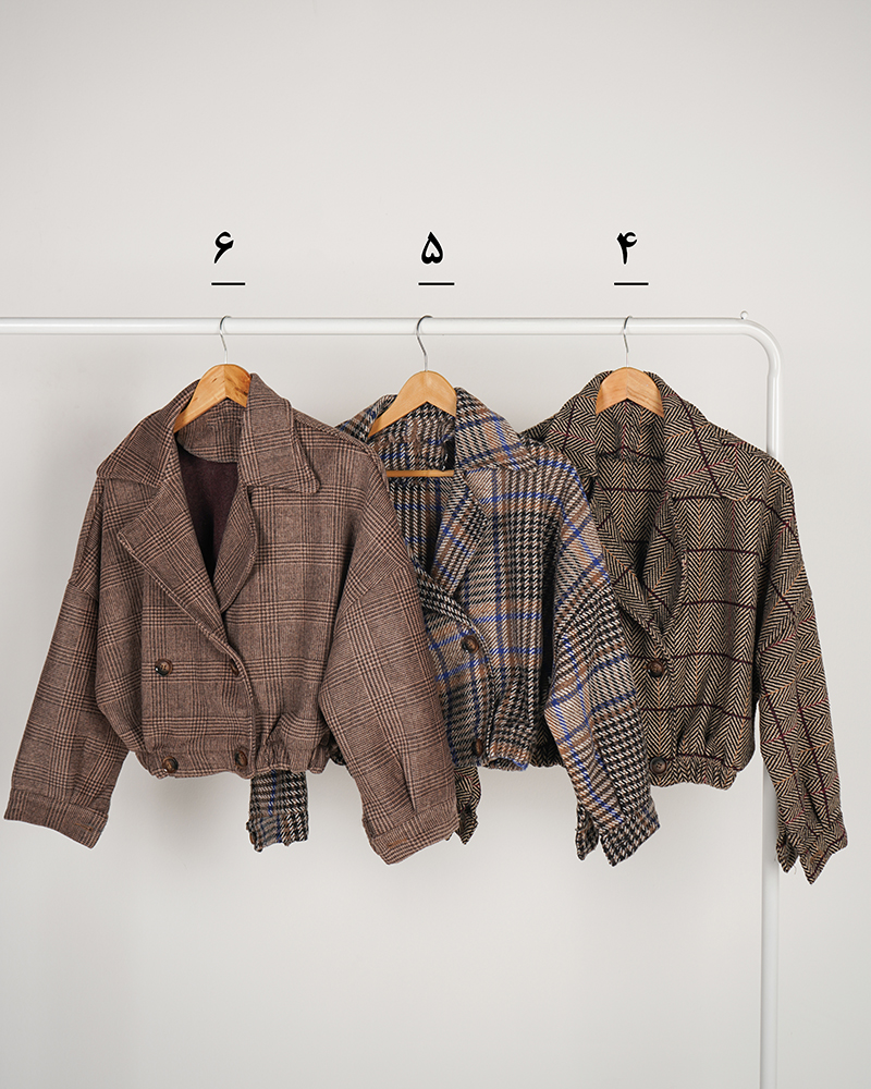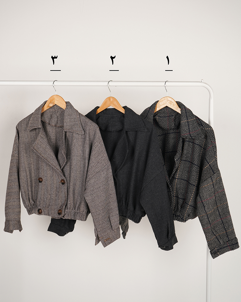 - توضیحات محصول: جنس کت کراپ، جناقی است. کت کراپ، فاقد آستر می باشد. کت کراپ یقه انگلیسی و کمر کش است.