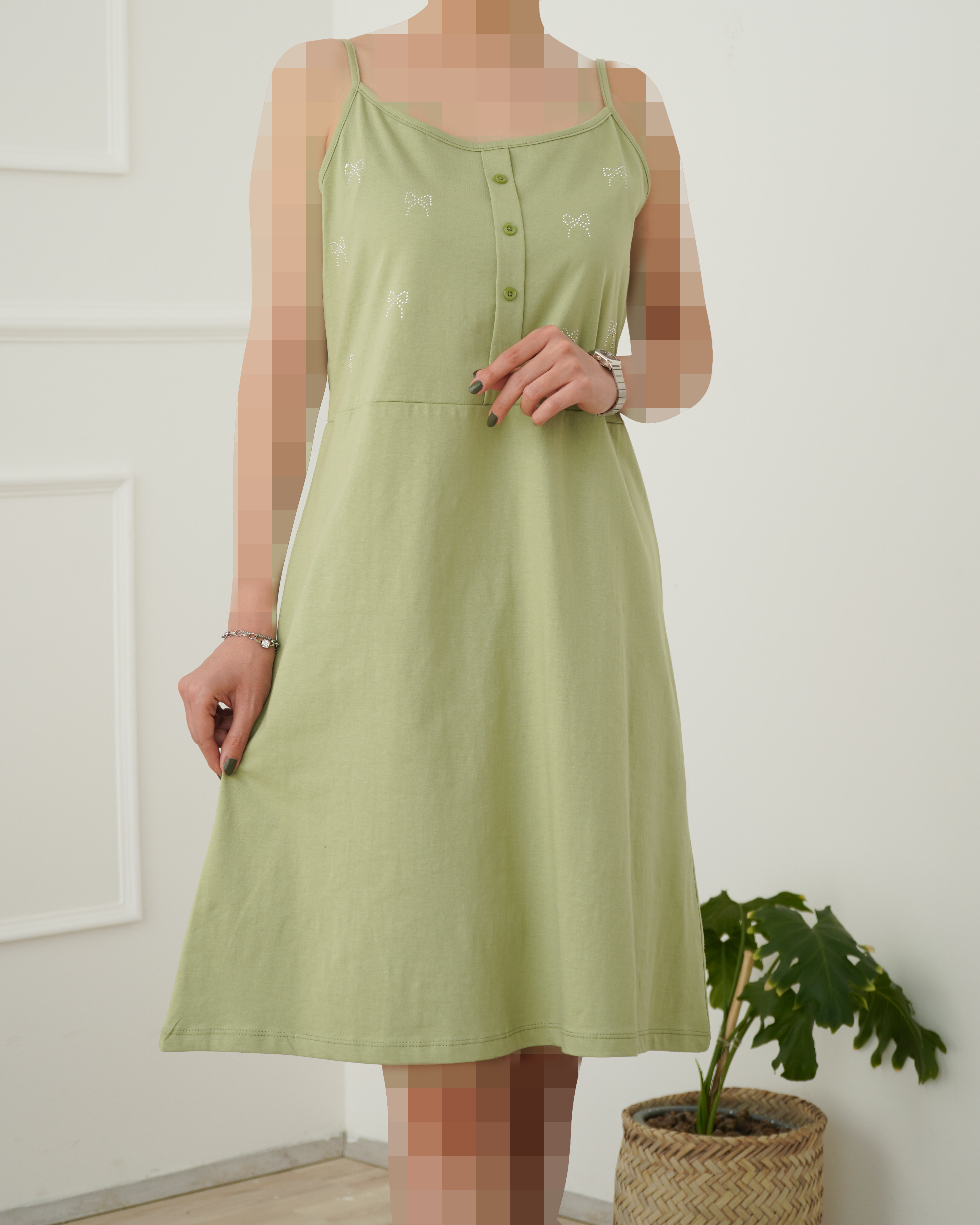 - توضیحات محصول: جنس سارافون نخ و پنبه می باشد. دکمه های روی لباس، نما هستند. سارافون بندی می باشد. روی سارافون نگین کارشده است. این سارافون بسیار خنک و راحت مناسب استفاده روزانه در منزل می باشد.