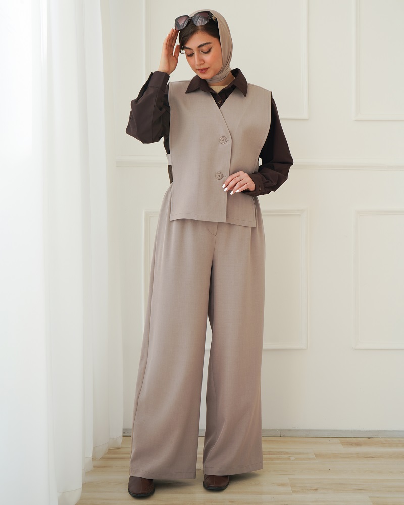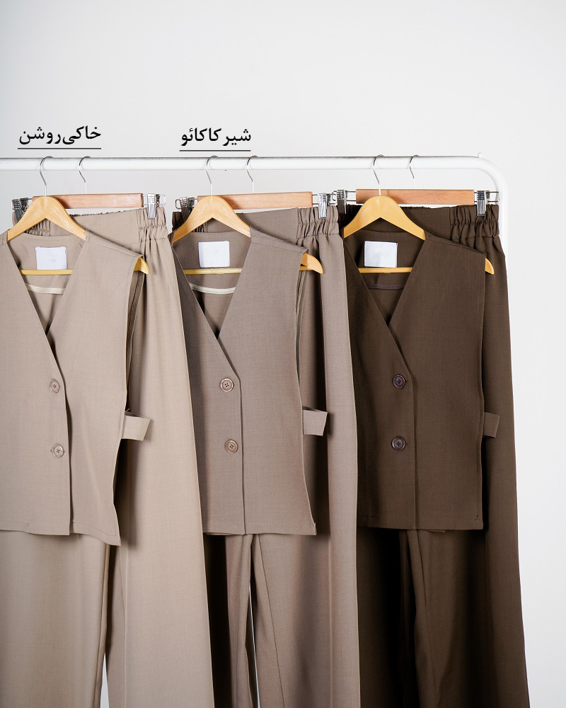 - توضیحات محصول: جنس ست فیونا می باشد. دکمه های وست کاربردی هستند. کمر شلوار پشت کشی و تنخور شلوار بگ می باشد. جلوی وست آستر کشی شده است.