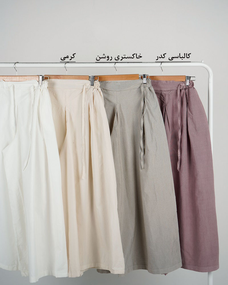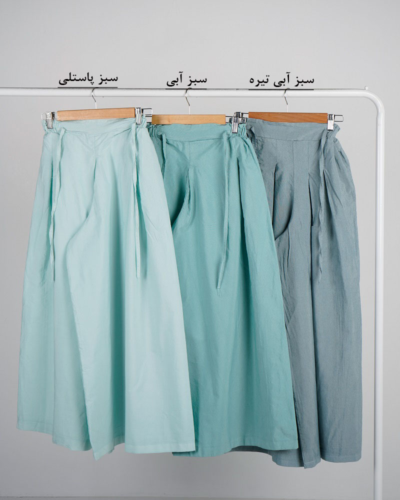 - توضیحات محصول: جنس شلوار دامنی، تترون پلی استر می باشد. کمر شلوار دامنی پشت کشی است. دارای دو جیب کاربردی، می باشد. پارچه لباس شسته شده و بدون آبرفت می باشد.