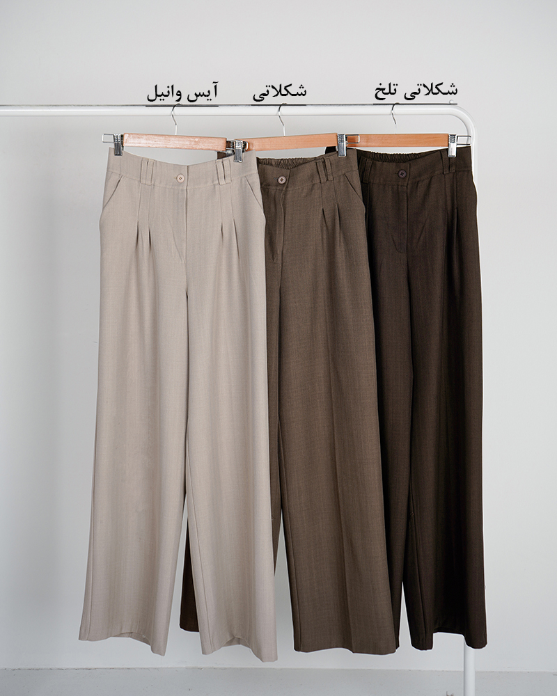 - توضیحات محصول: جنس شلوار، کرپ جناقی است. شلوار تنخور فول بگ دارد. کمر شلوار پشت کشی و بندینک (جای کمربند) دارد. دارای دو جیب کاربردی می باشد.