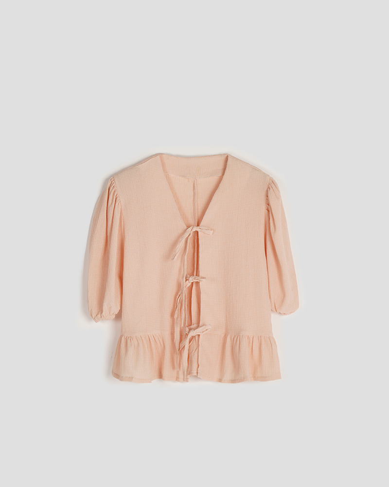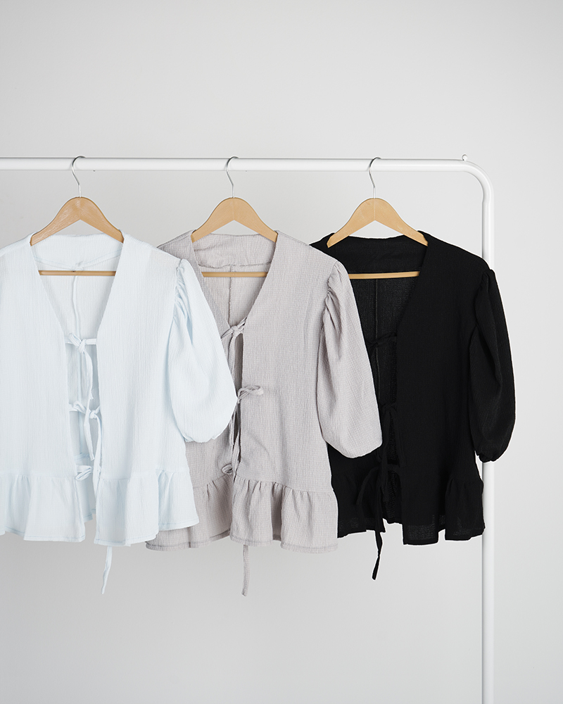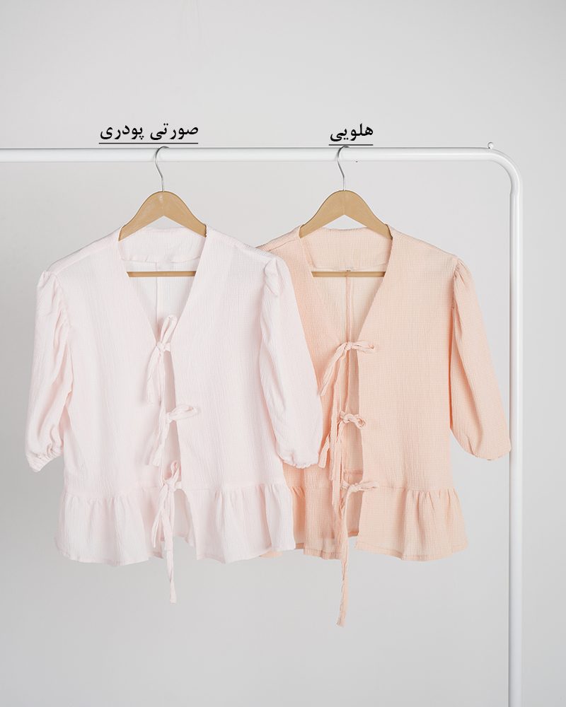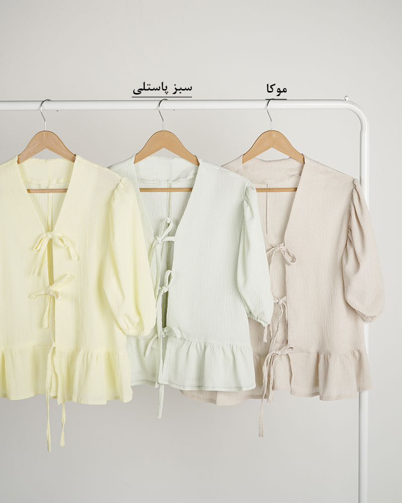 - توضیحات محصول: جنس شومیز کریشه پفکی می باشد. شومیز یقه گرد و جلو بندی می باشد. آستین ها و دور باسن شومیز چین دار است.