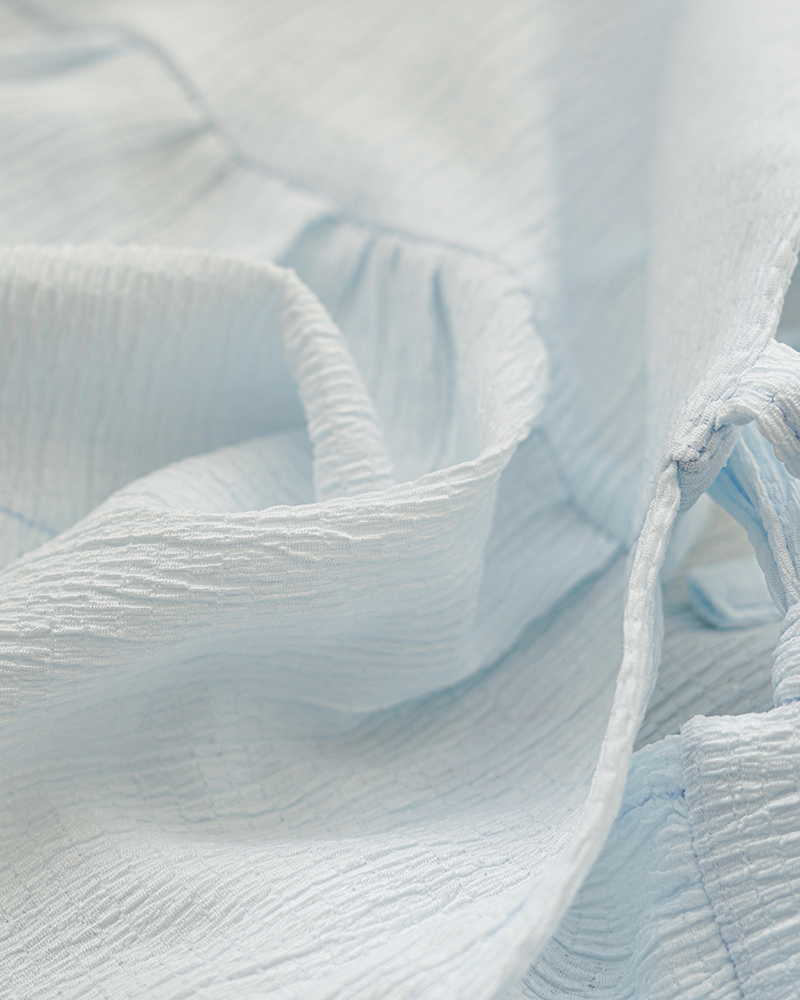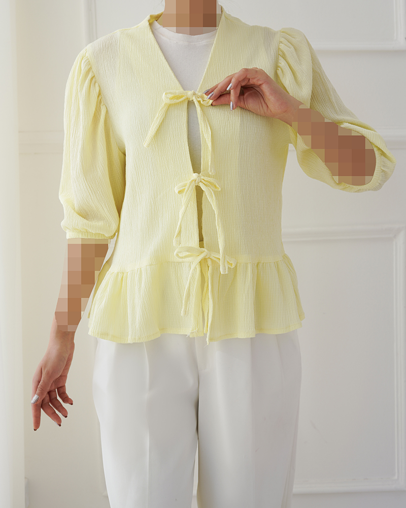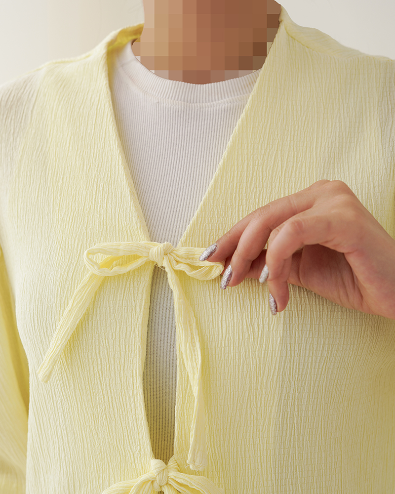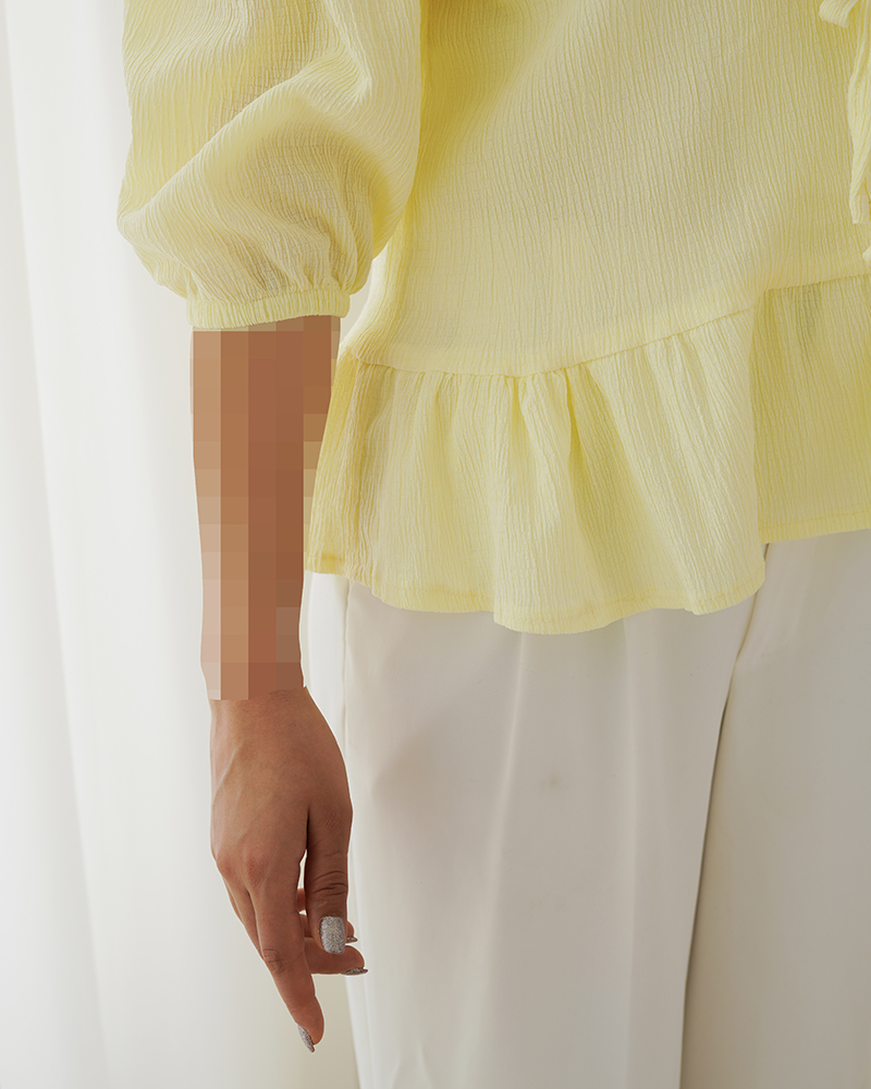 - توضیحات محصول: جنس شومیز کریشه پفکی می باشد. شومیز یقه گرد و جلو بندی می باشد. آستین ها و دور باسن شومیز چین دار است.