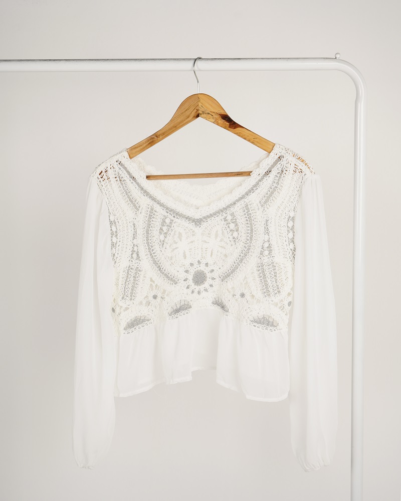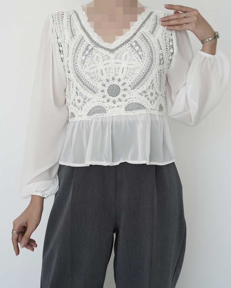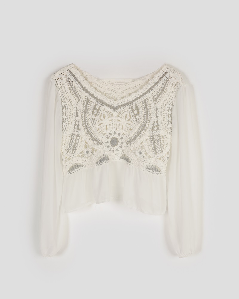 - توضیحات محصول: جنس شومیز ترکیبی از بافت قلاب بافی و حریر می باشد. شومیز یقه هفت و آستین بلند بوده و قسمت سر آستین این محصول کشدوزی شده است. شومیز بدن نما می باشد.