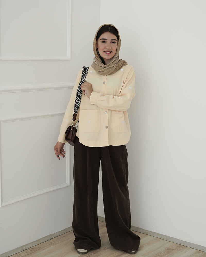 - توضیحات محصول: جنس شومیز کتان می باشد. شومیز یقه مردانه ،آستین بلند و همراه با دکمه های کاربردی در قسمت جلو و سر آستین می باشد. جیب های شومیز کاربردی می باشد.