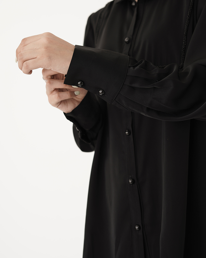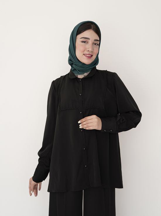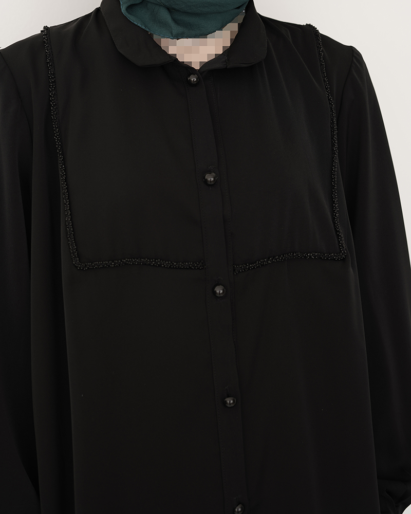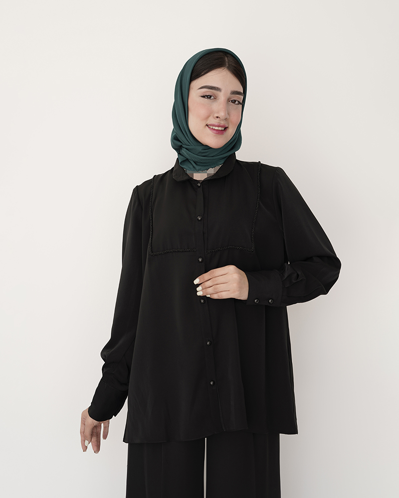 - توضیحات محصول: جنس شومیز کرپ عبایی می باشد. ش.میز یقه دیپلمات و جلو دکمه بوده و قسمت جلوی این شومیز کار شده می باشد.