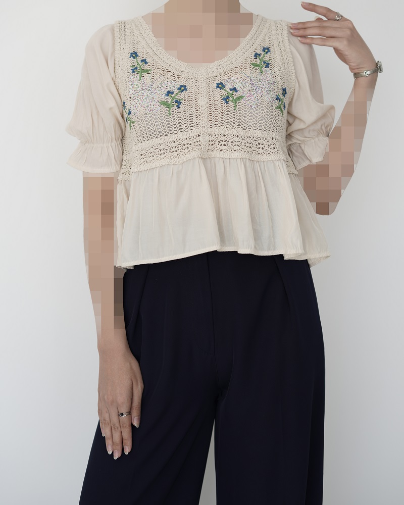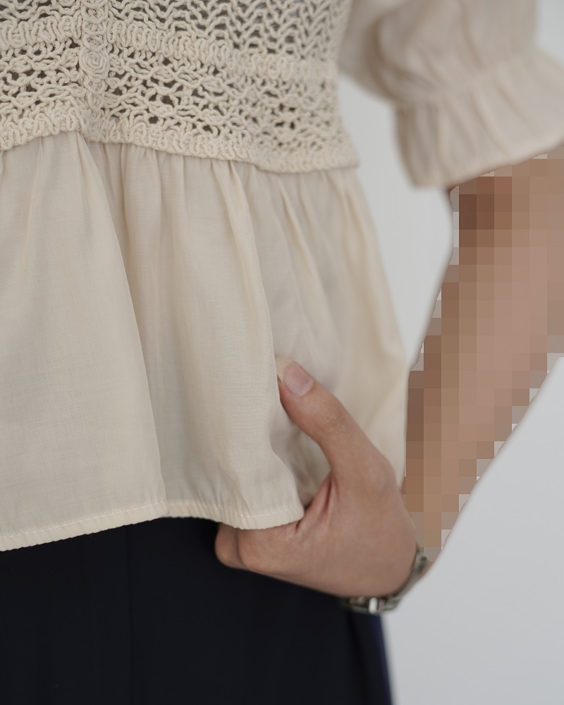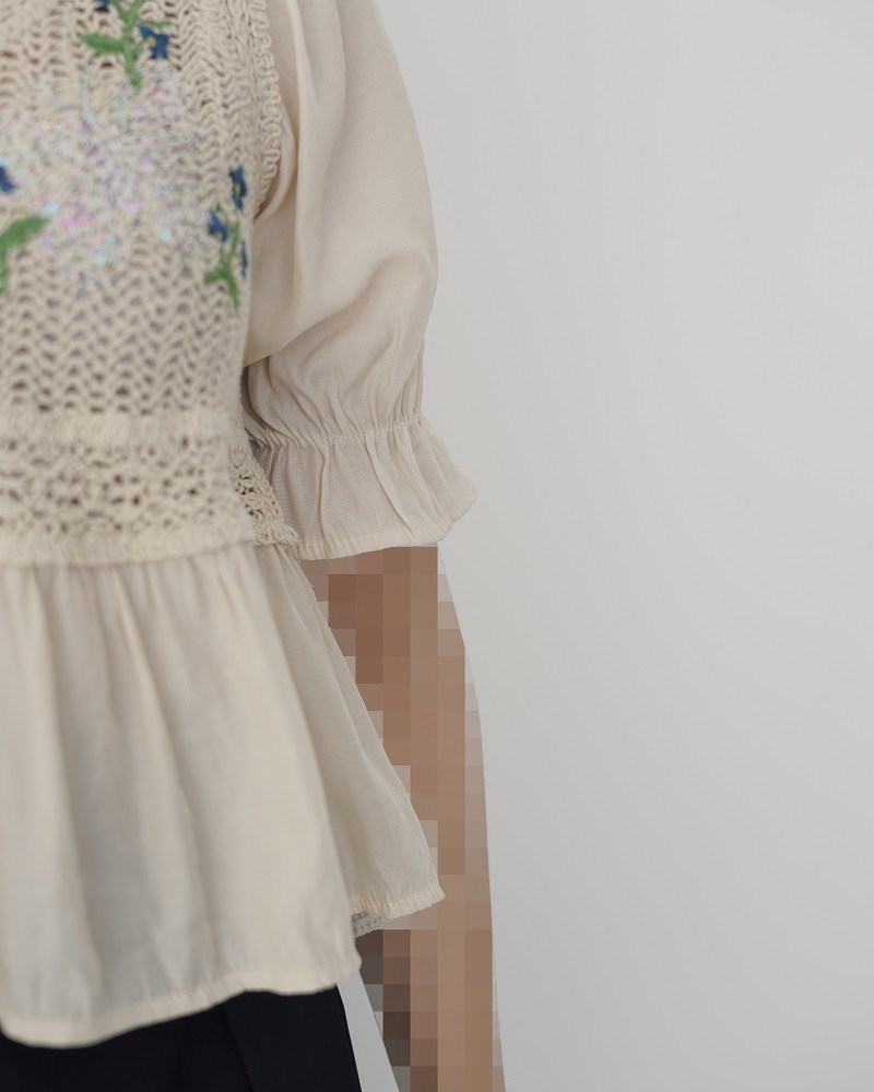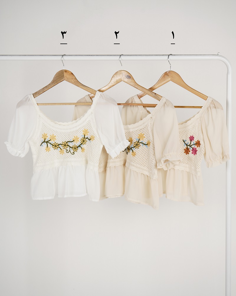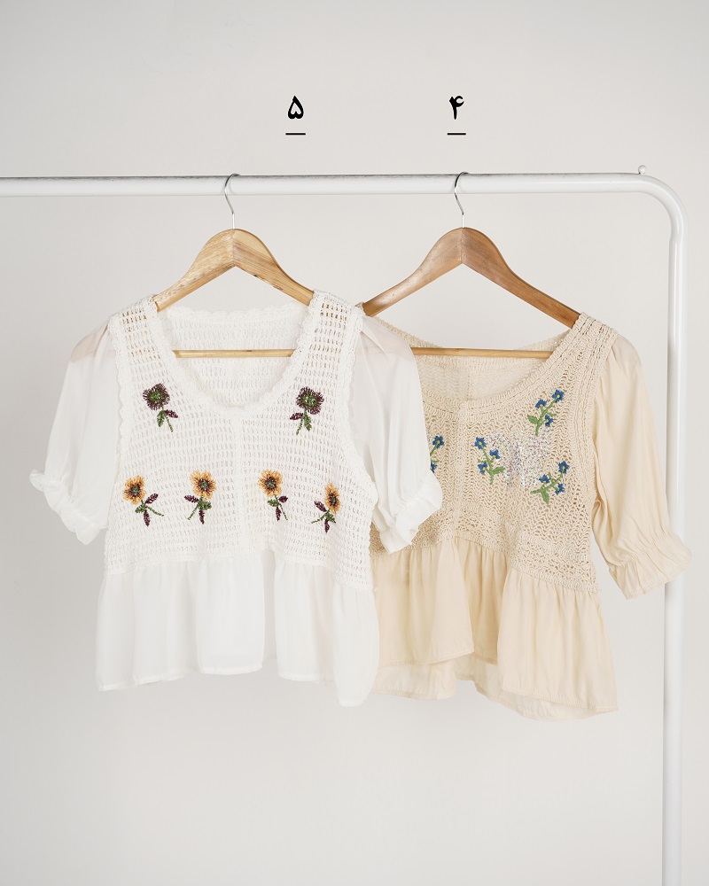 - توضیحات محصول: جنس شومیز ترکیبی از بافت قلاب بافی و حریر می باشد. شومیز یقه هفت و آستین بلند بوده و قسمت سر آستین این محصول کشدوزی شده است. شومیز بدن نما می باشد.