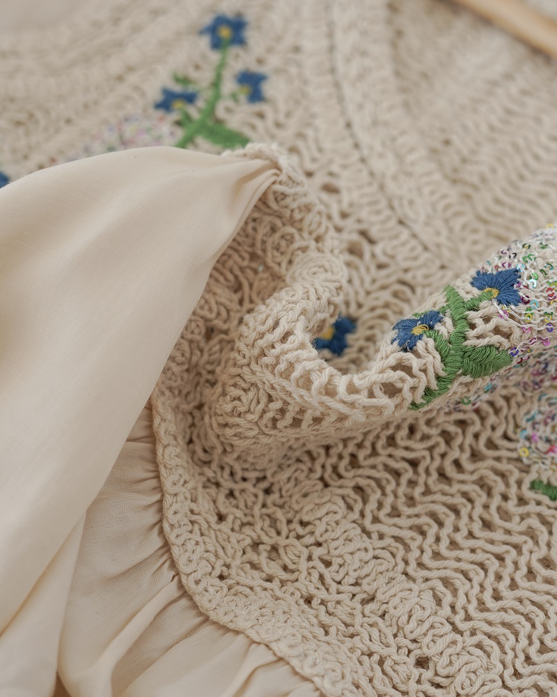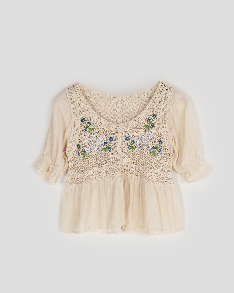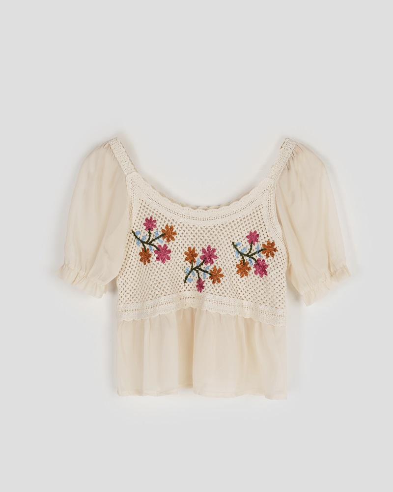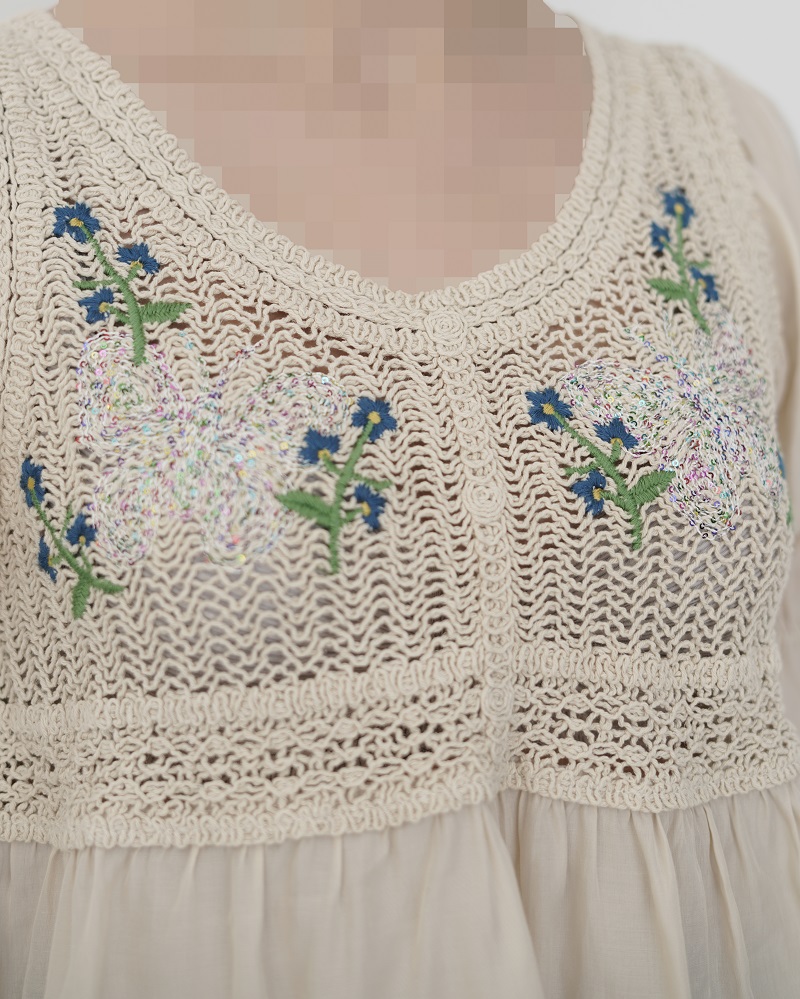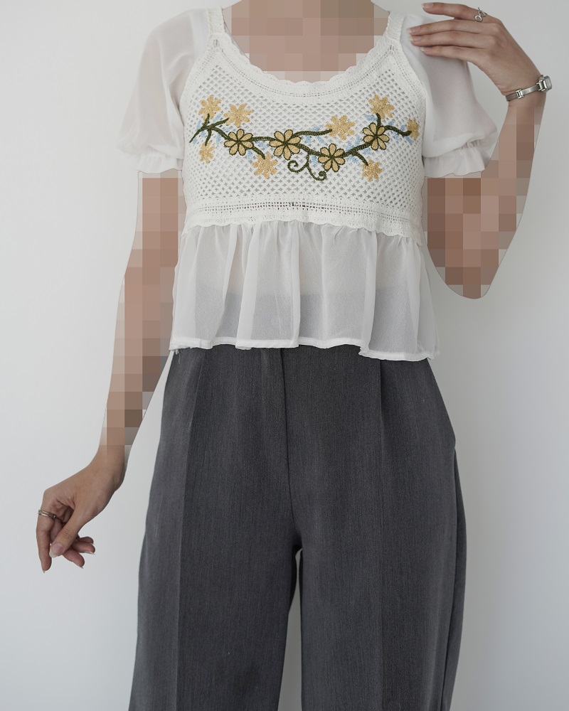 - توضیحات محصول: جنس شومیز ترکیبی از بافت قلاب بافی و حریر می باشد. شومیز یقه هفت و آستین بلند بوده و قسمت سر آستین این محصول کشدوزی شده است. شومیز بدن نما می باشد.