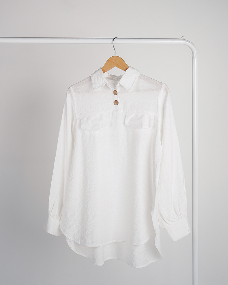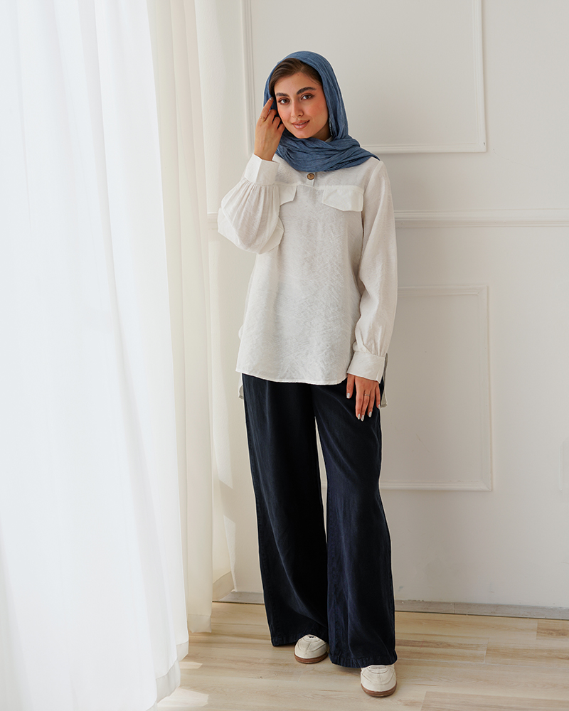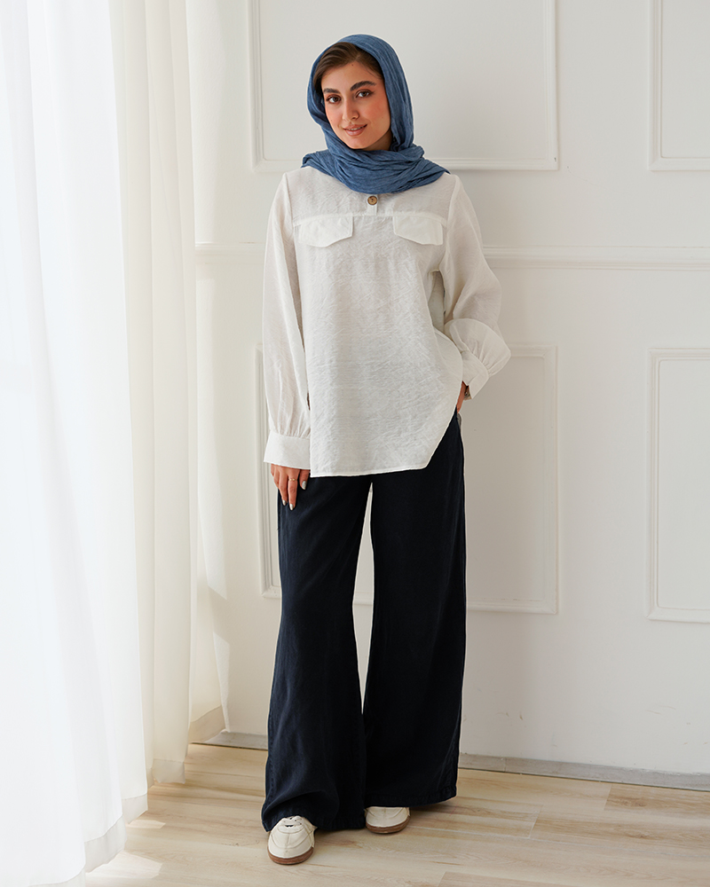 - توضیحات محصول: جنس شومیز، کتیبه است. شومیز جلو بسته می باشد. شومیز یقه مردانه و دکمه های یقه کاربردی هستند. جیب ها نما می باشد.