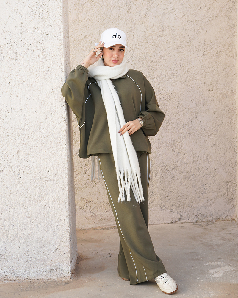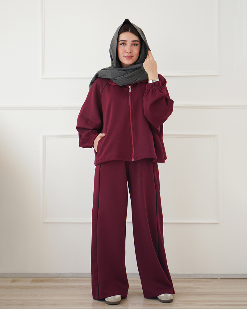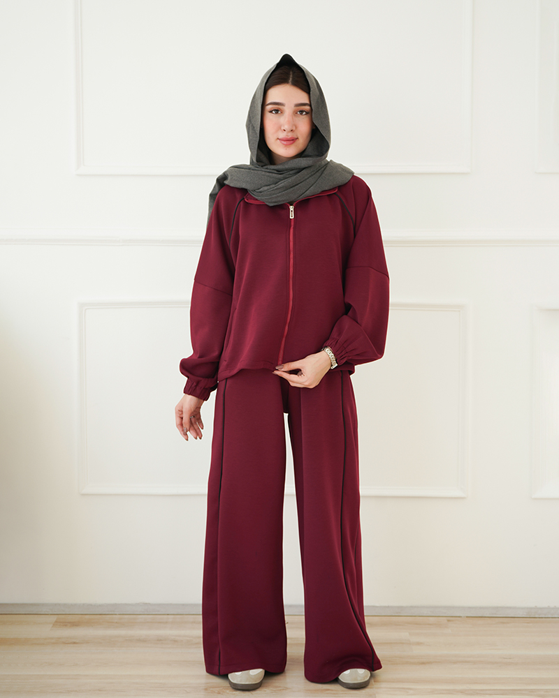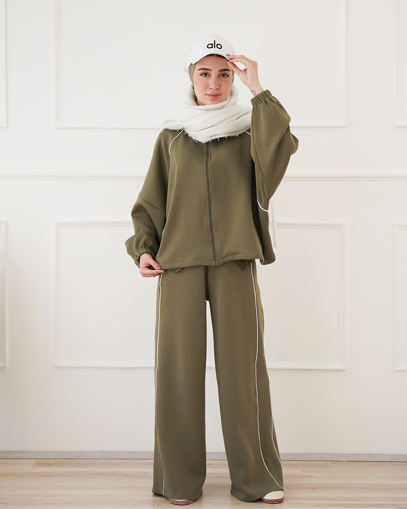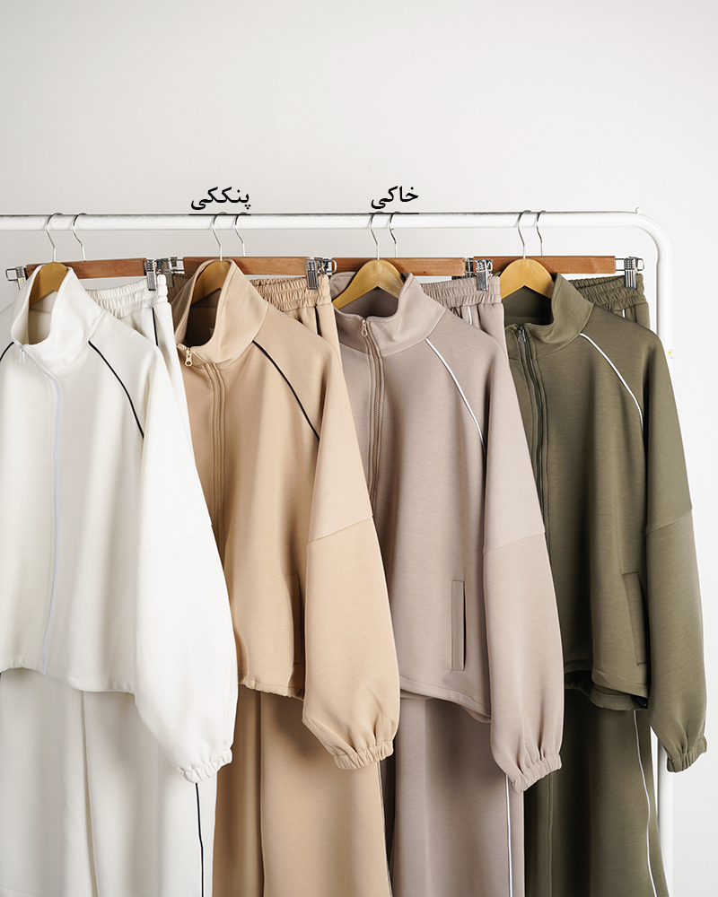 - توضیحات محصول: جنس ست اویشو می باشد. ست شامل یک سویشرت و یک شلوار است. سویشرت یقه مردانه و جلو زیپی است. قسمت سر آسیتن این محصول کشی بوده و جیب های سویشرت کاربردی هستند. دور کمر شلوار تماما کشی بوده و تنخور شلوار بگ می باشد. جیب های شلوار کاربردی هستند.