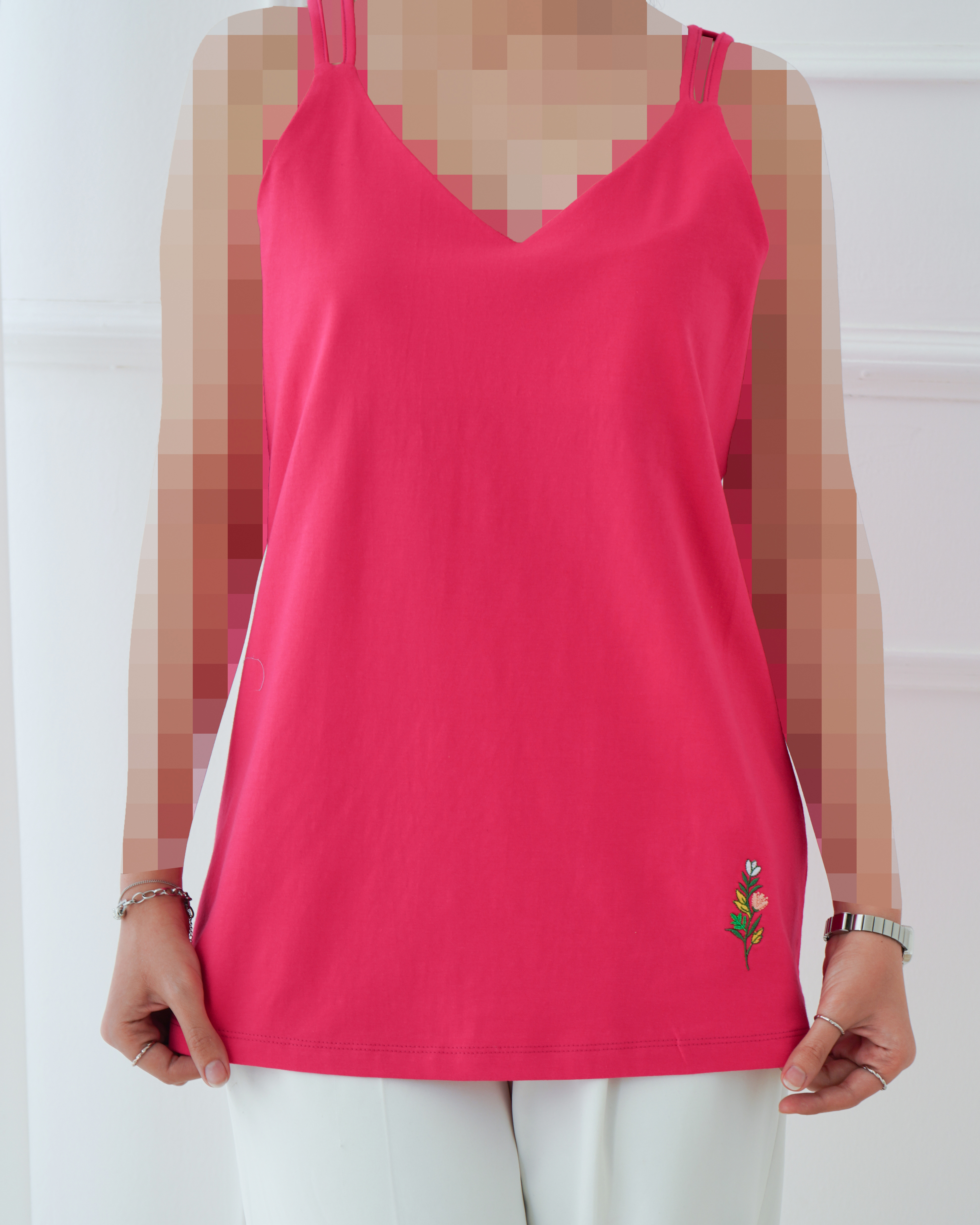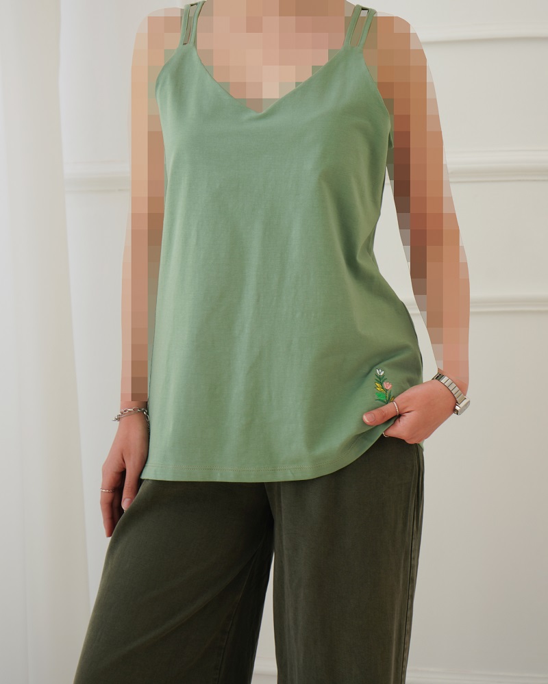 - توضیحات محصول: جنس تاپ نخ و پنبه است. تاپ یقه هفت و آستین حلقه ای می باشد. طرح روی تاپ، گلدوزی شده است.