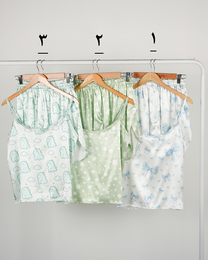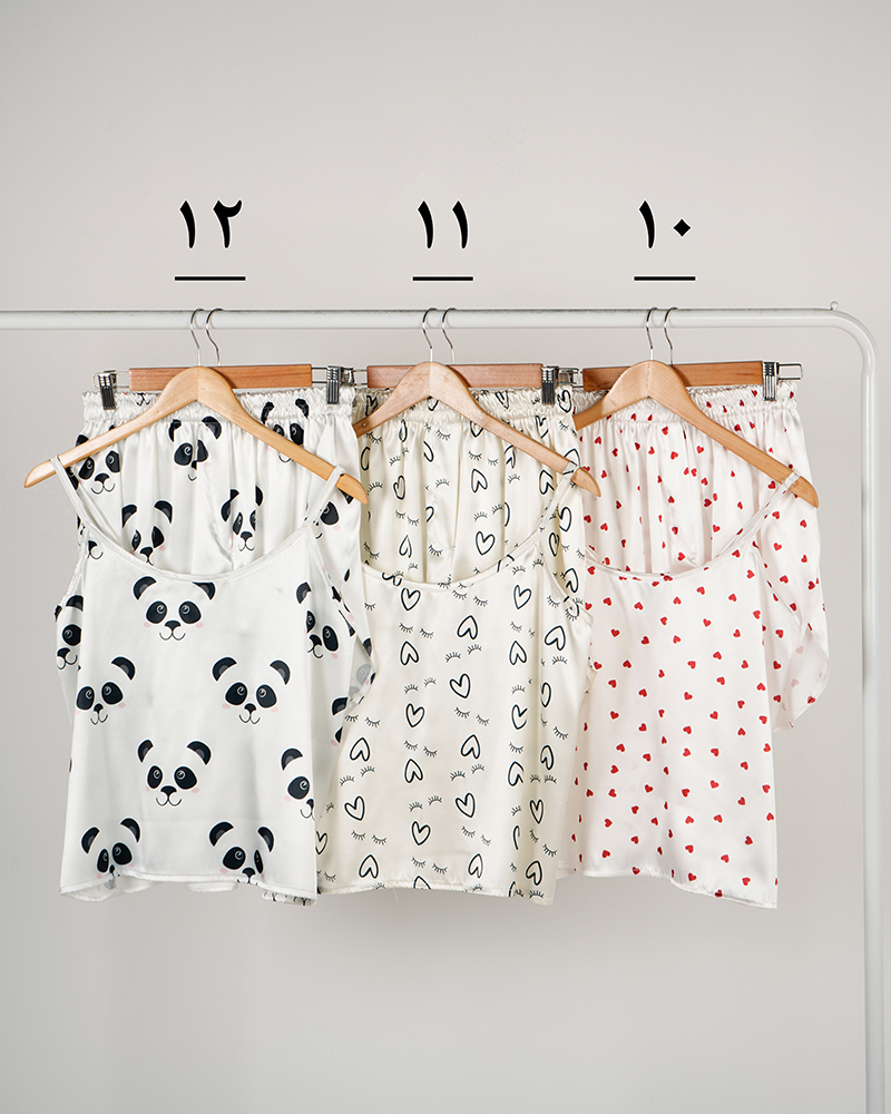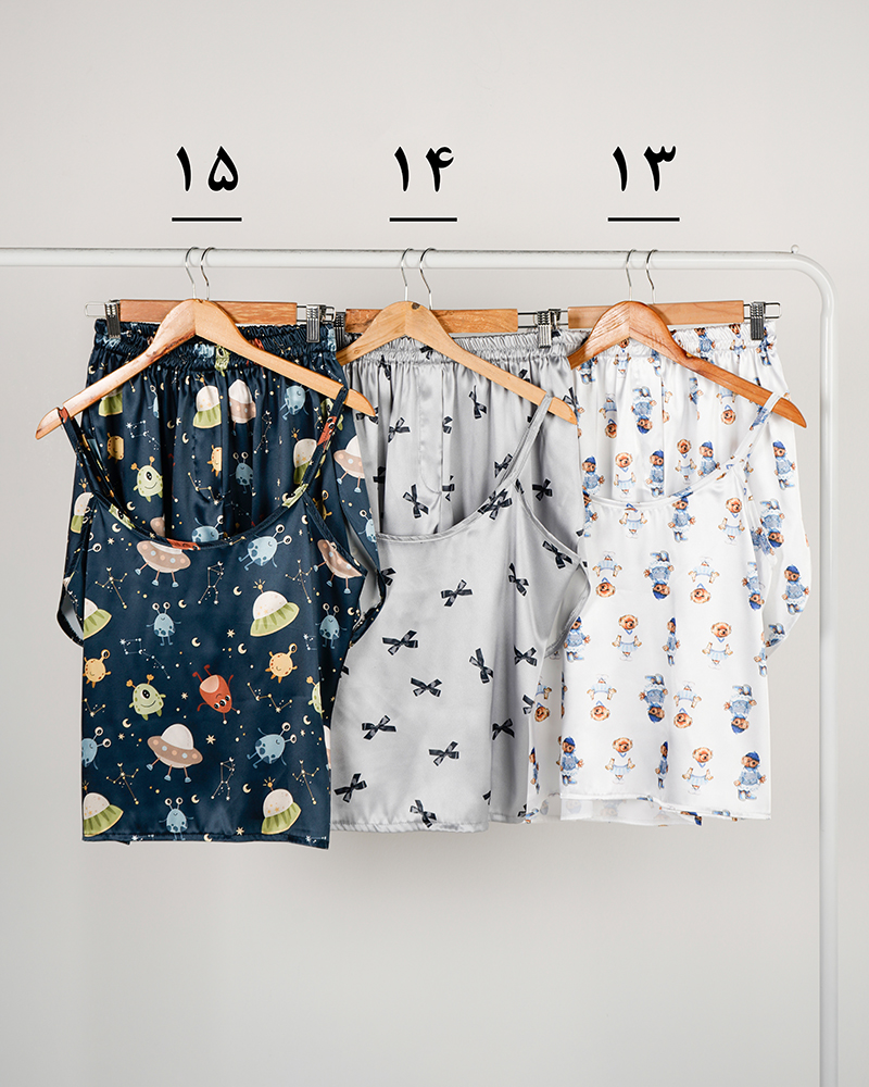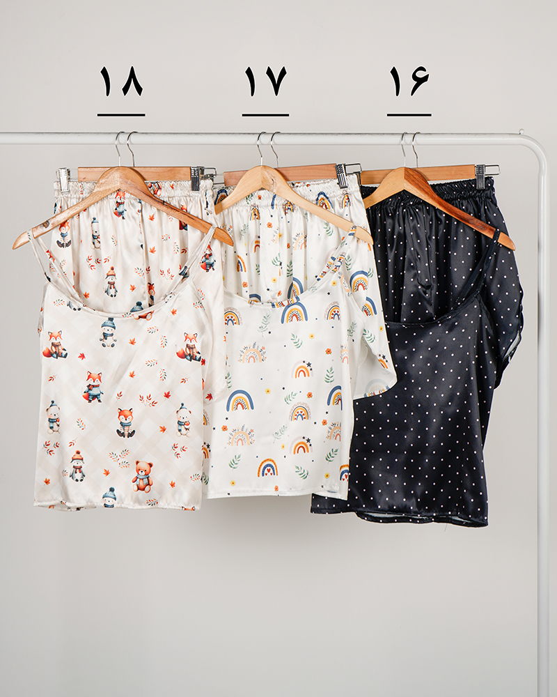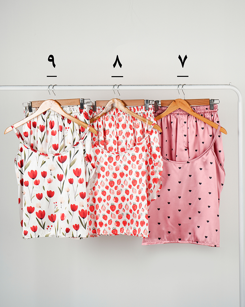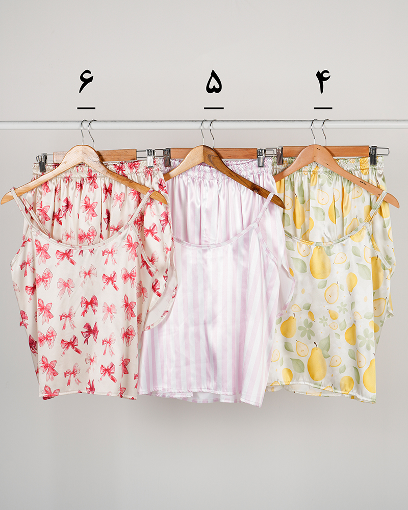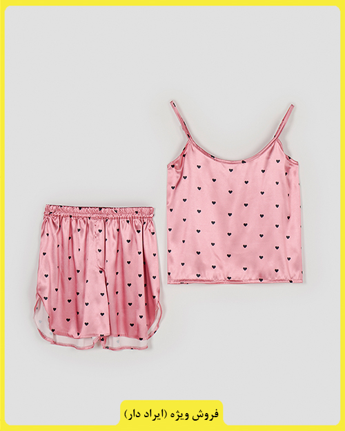 - توضیحات محصول: جنس ست، ساتن است. تاپ بندی و پشت کشی است. بند های تاپ، قابل تنظیم می باشد. کمر شورتک تمام کشی است.ایراد جزئی از قبیل وجود یک خط سفید پشت یقه لباس می باشد.