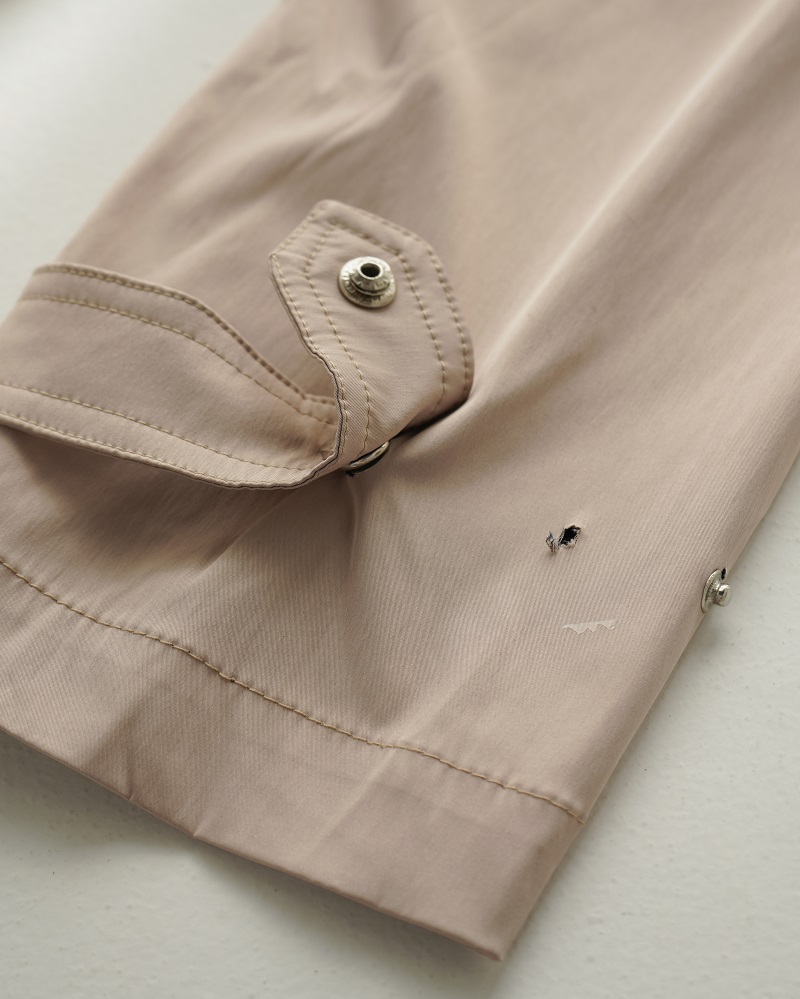 - توضیحات: جنس ترنج کت مموری می باشد. ترنج کت یقه انگلیسی و با قد بلند مناسب استفاده روزمره می باشد. جیب های بارونی کاربردی بوده و بارونی دارای یک کمر بند از جنس لباس می باشد. ایراد جزئی از قبیل سروراخ بودن جای دکمه بند آستین می باشد.