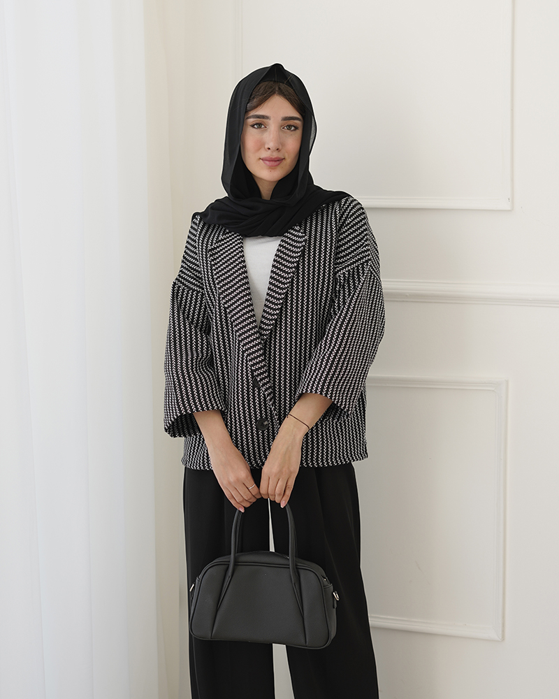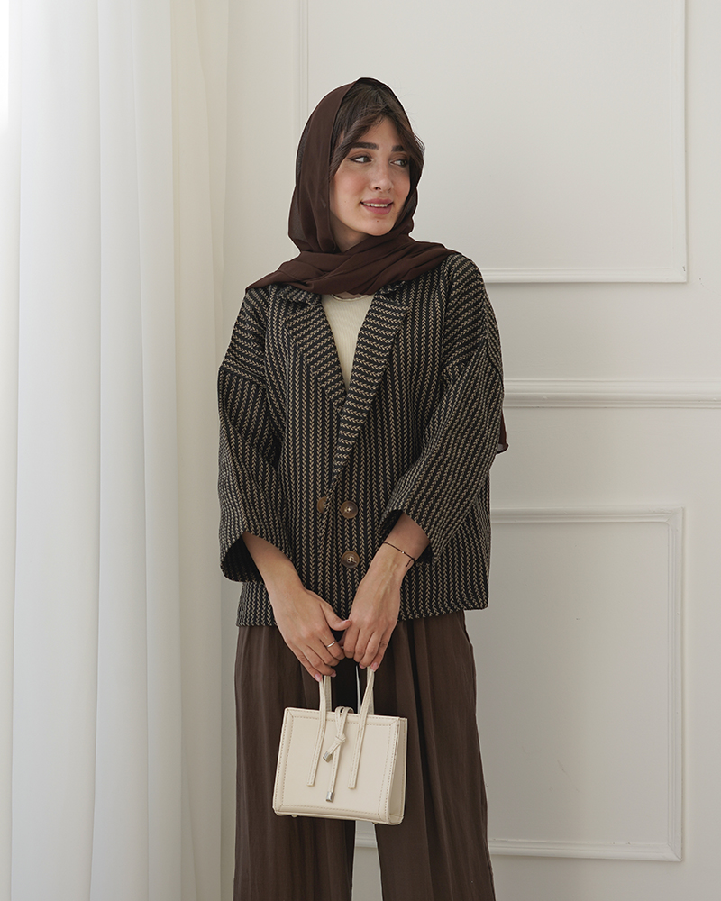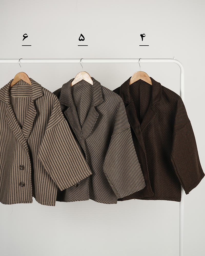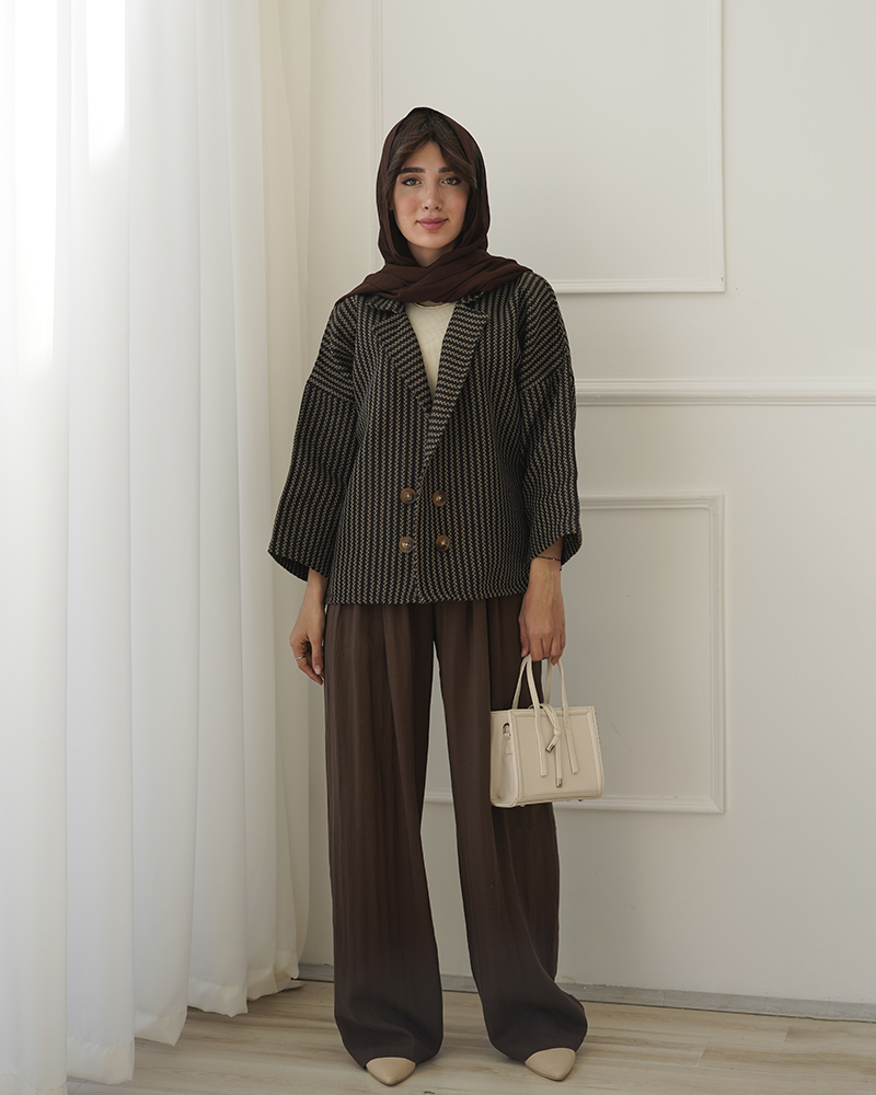 - توضیحات محصول: جنس ترنج کت، فوتر جناقی است. کت جلو باز و دکمه ها نما هستند. کت، یقه انگلیسی است.