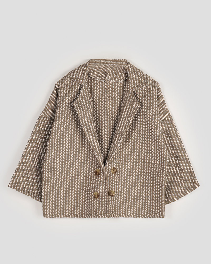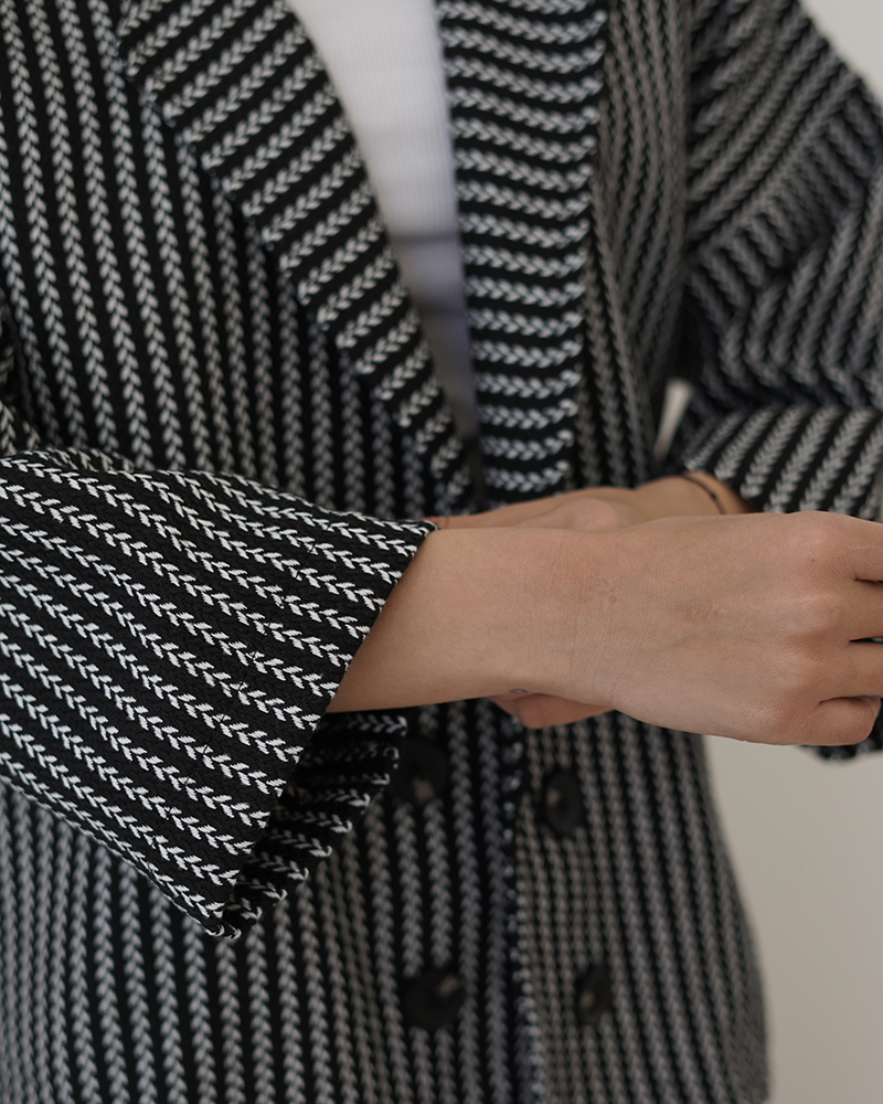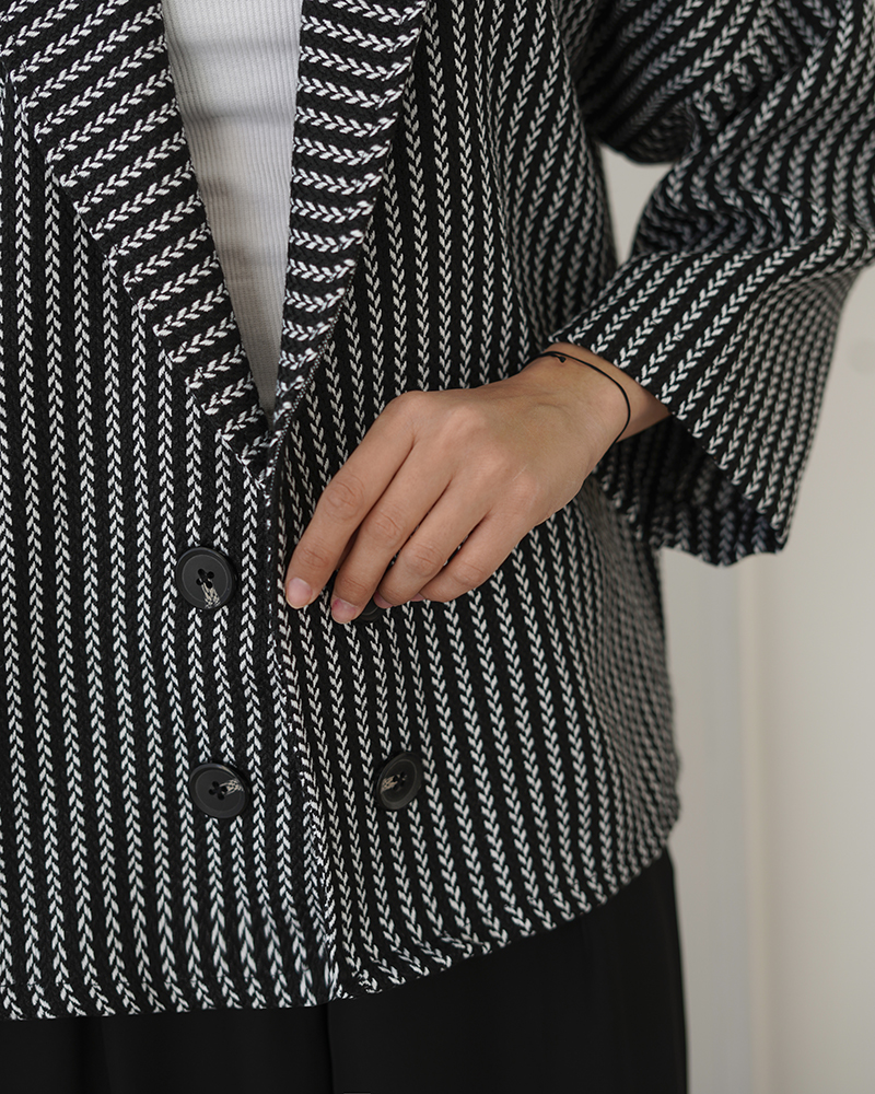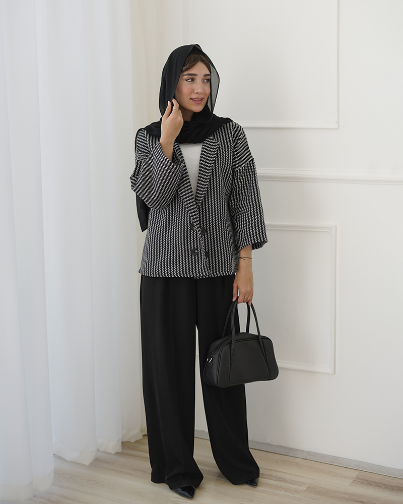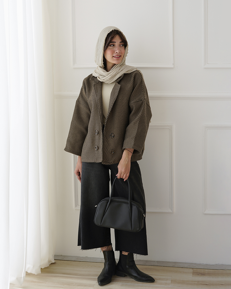 - توضیحات محصول: جنس ترنج کت، فوتر جناقی است. کت جلو باز و دکمه ها نما هستند. کت، یقه انگلیسی است.