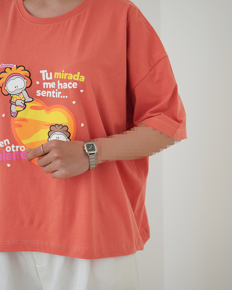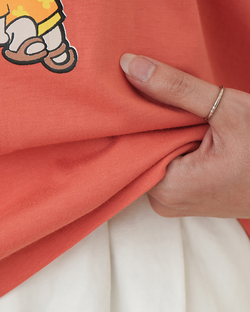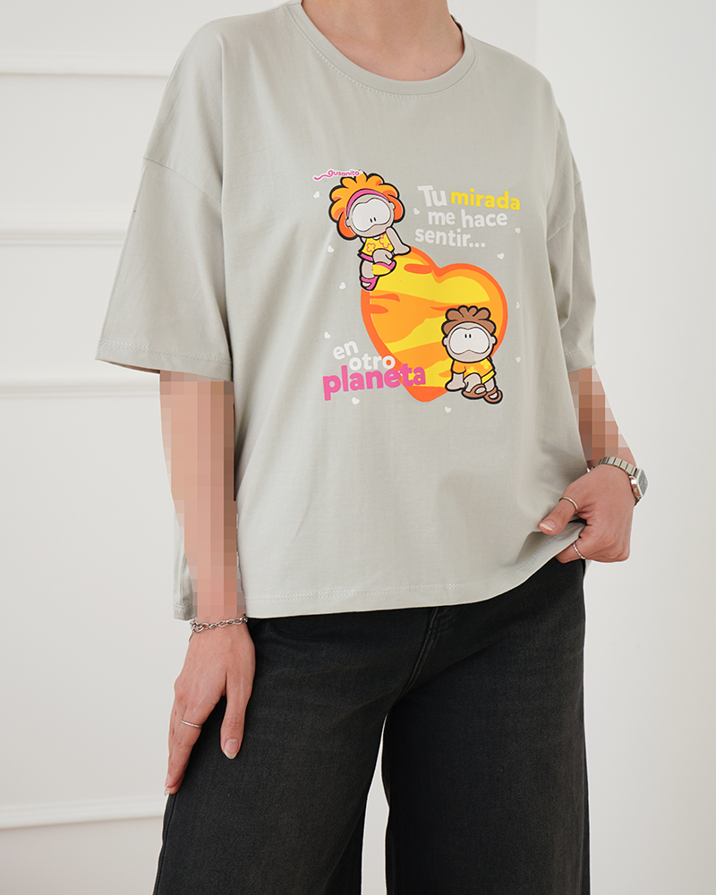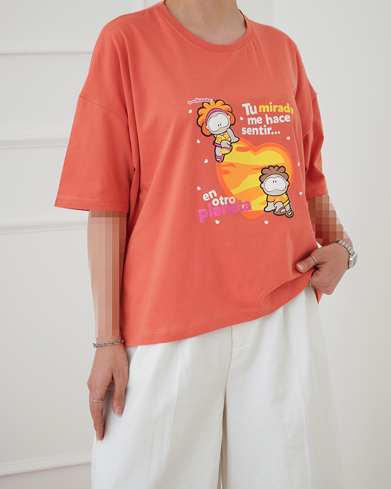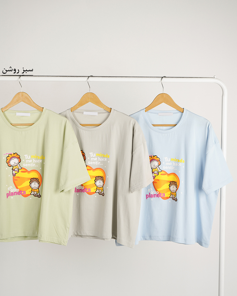 - توضیحات محصول: جنس تیشرت نخ و پنبه می باشد. تیشرت یقه گرد و آستین کوتاه می باشد. طرح های روی تیشرت چاپی است. تنخور تیشرت باکسی است. این محصول بسیار نرم و لطیف و خنک همراه با کشسانی مناسب استفاده روزمره می باشد.