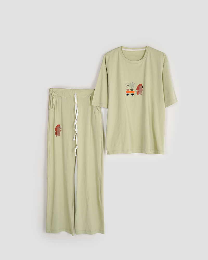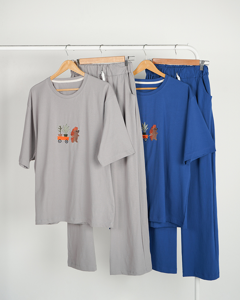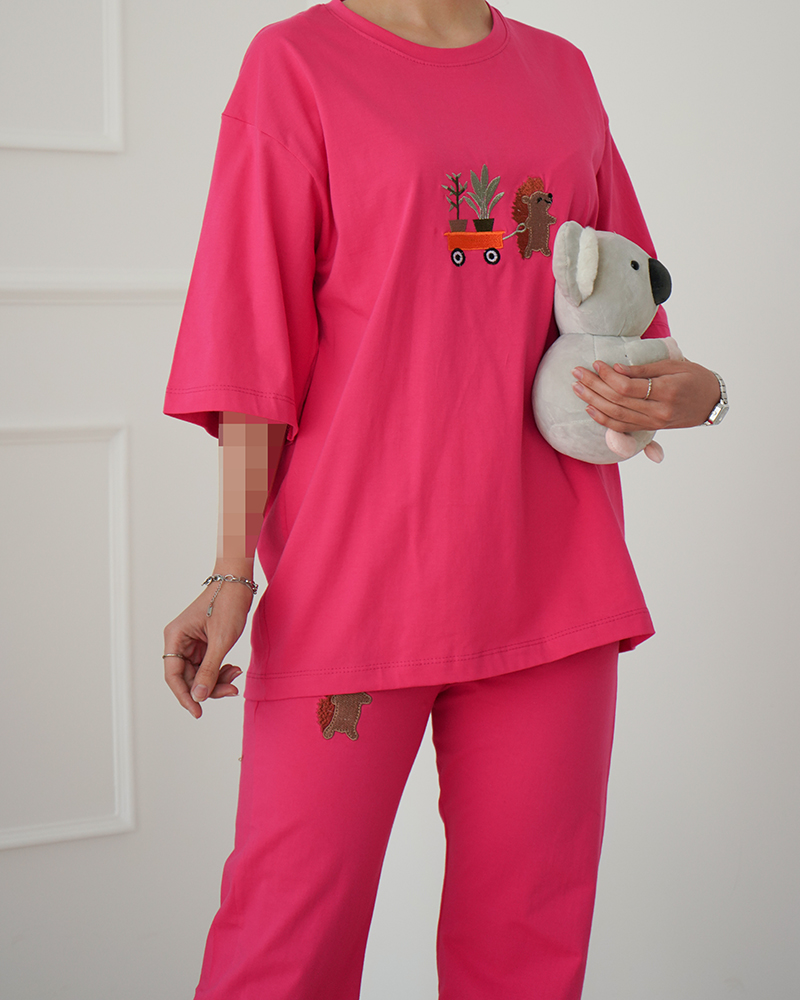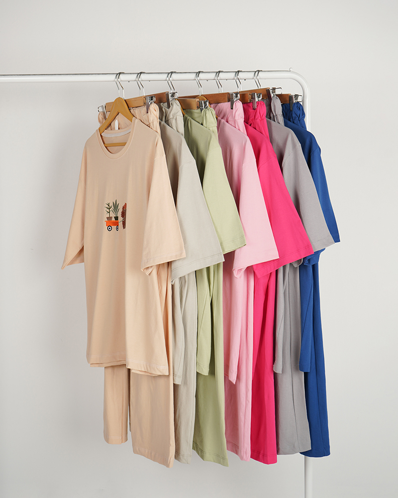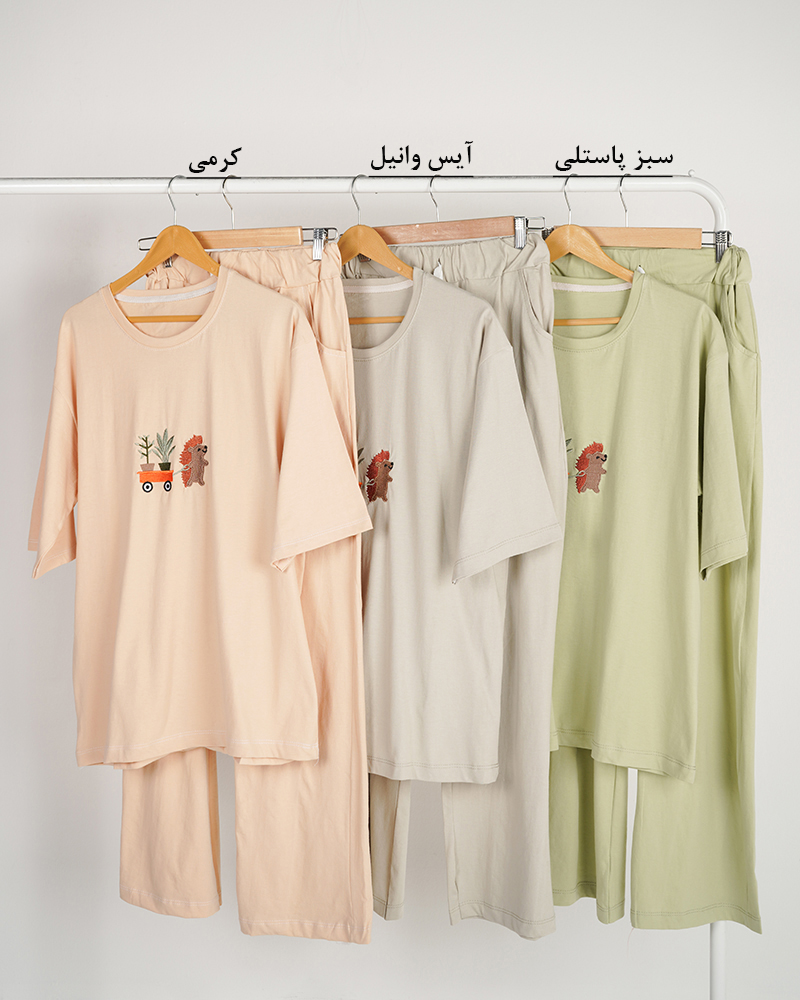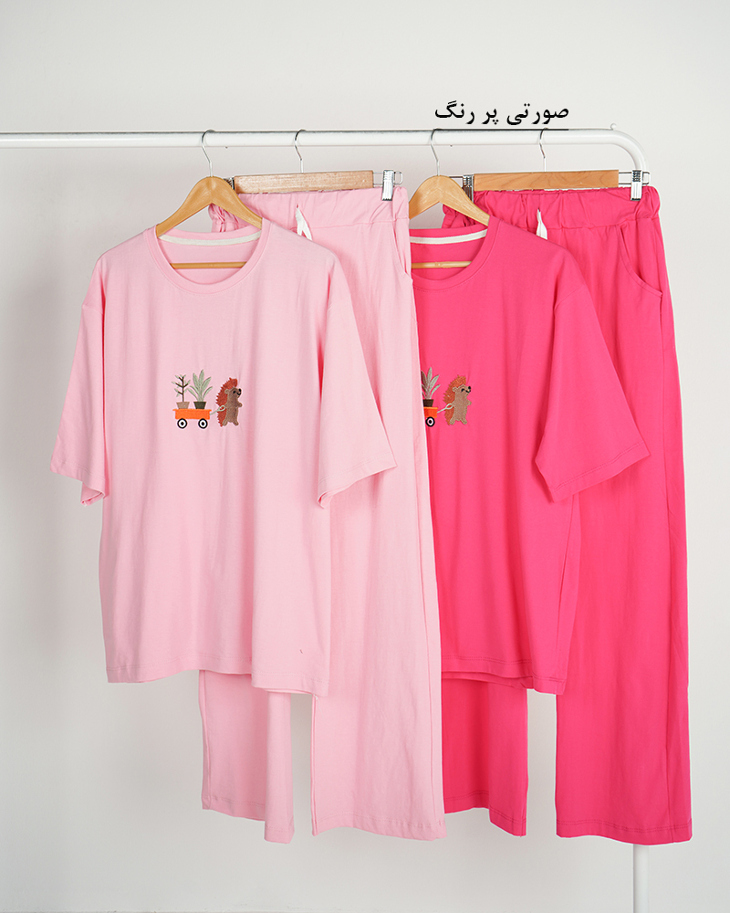 - توضیحات محصول: جنس تیشرت و شلوار نخ و پنبه می باشد. تیشرت یقه گرد و آستین کوتاه می باشد. طرح های روی ست گلدوزی شده هستند. کمر شلوار تماما کشی بوده و بند دور کمر کاربردی است.